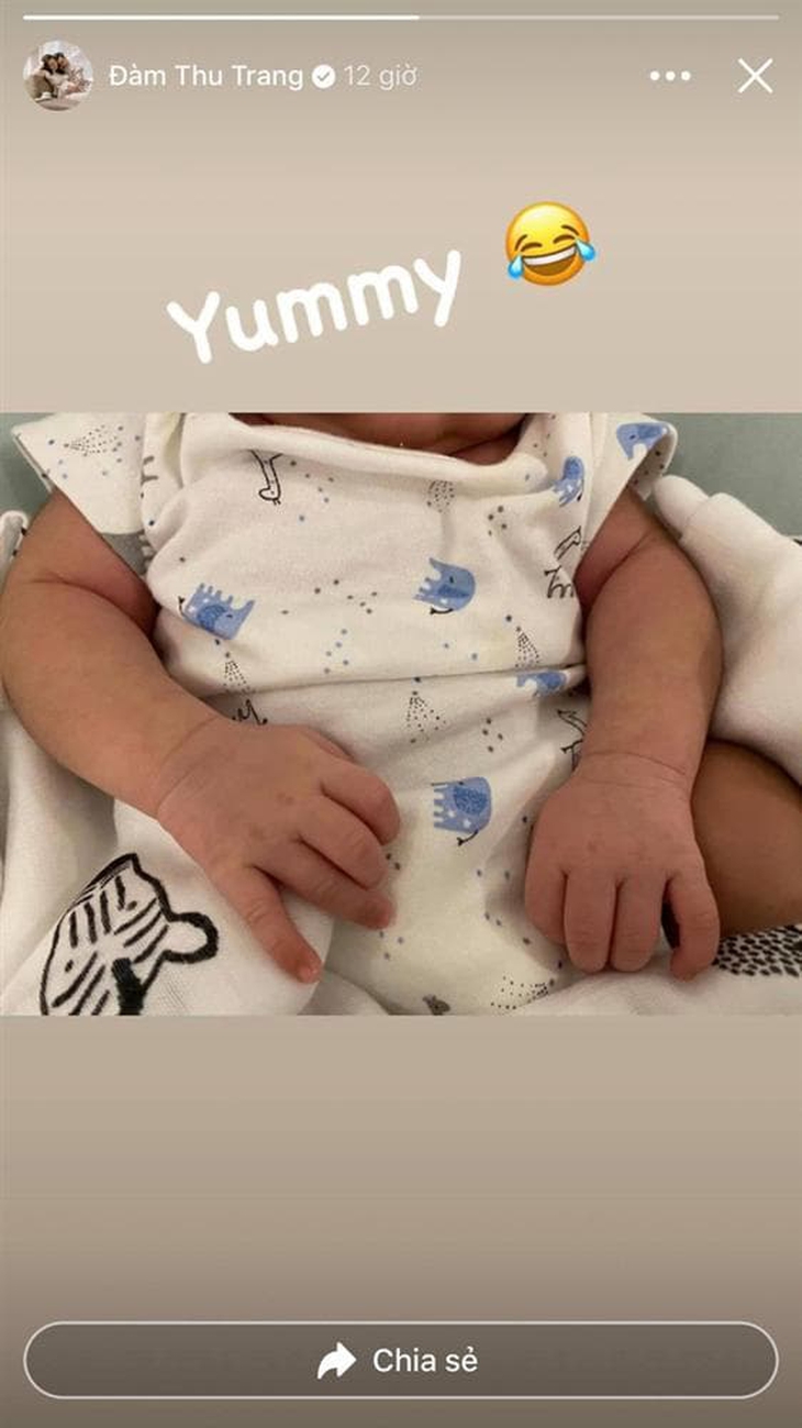Dù thường xuyên khoe quà tặng con nhưng vợ chồng Cường Đô La và Đàm Thu Trang vẫn một mực giấu chân dung con gái cưng. Tuy nhiên, cựu người mẫu vẫn không kìm lòng được mà "nhá hàng" hình ảnh của bé Suchin lên trang cá nhân khiến fan cực kỳ thích thú. Dù chưa tròn một tháng tuổi, cô bé đã phát triển khá tốt với tay chân mũm mĩm, đáng yêu.