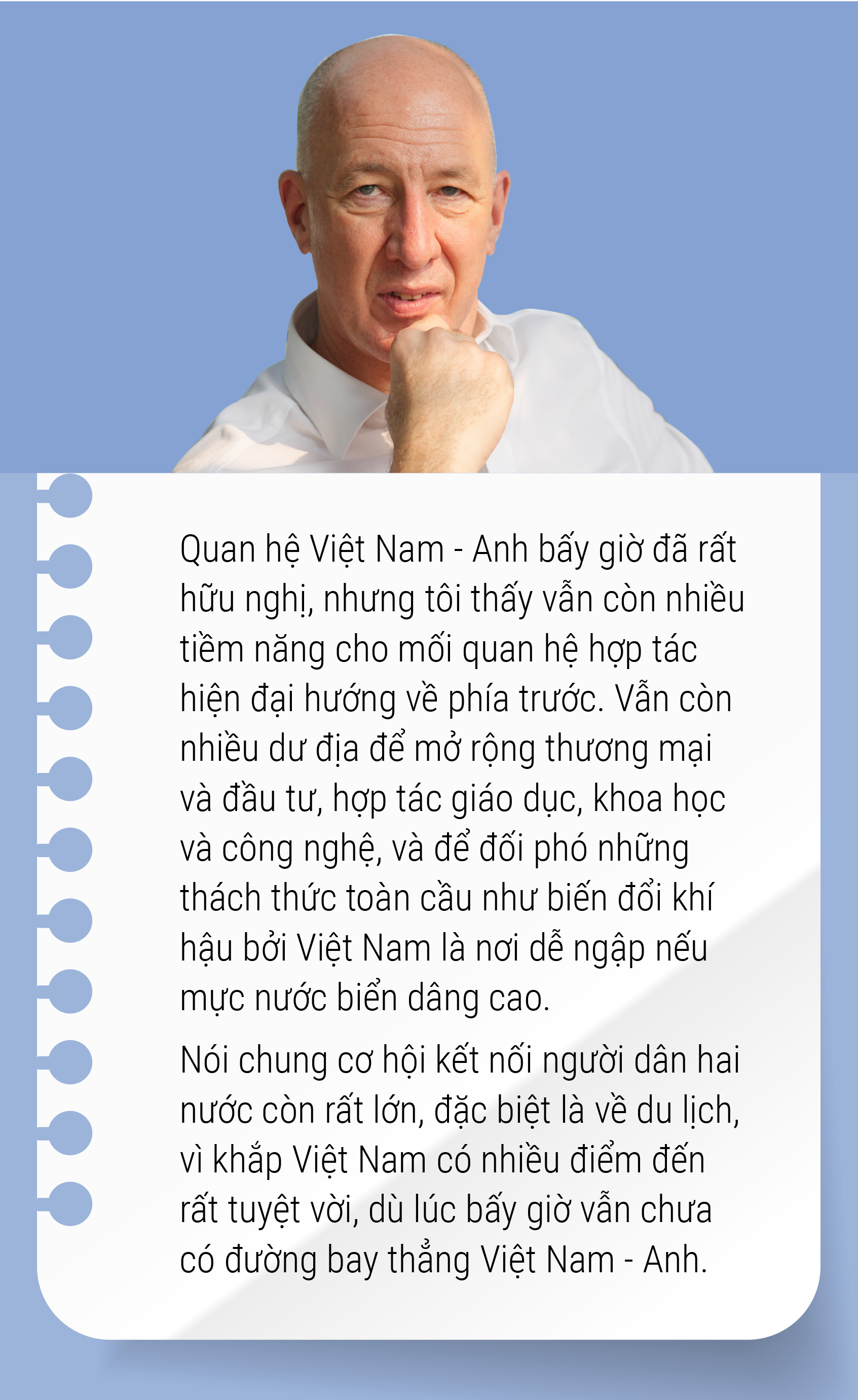 Tuần lễ tuyệt vời đó giúp tôi thấy mọi thứ ở Việt Nam đã thay đổi thế nào. Tôi bay từ phi trường Heathrow (London) đến Việt Nam trên chuyến bay thẳng của Vietnam Airlines. Quan hệ đối tác chiến lược giữa hai nước đã được làm mới vào năm 2020 và quan hệ song phương giờ đã đi cả vào chiều rộng lẫn bề sâu.