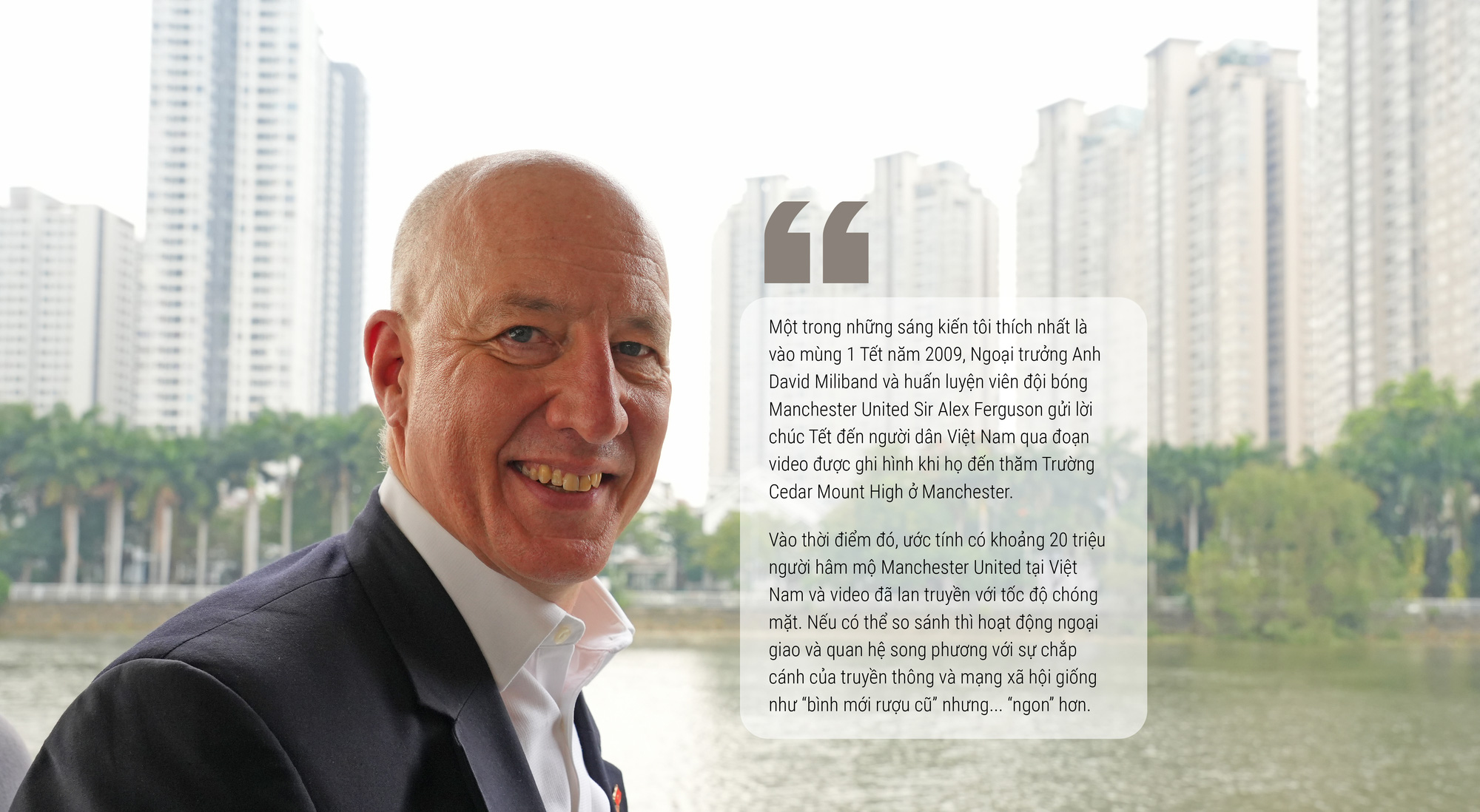 Chúng tôi mở rộng sự hiện diện của đại sứ quán trên truyền thông xã hội, lập các kênh YouTube và Flickr, rồi năm 2009, Đại sứ quán Anh trở thành đại sứ quán đầu tiên tại Việt Nam ra mắt trang Facebook riêng.