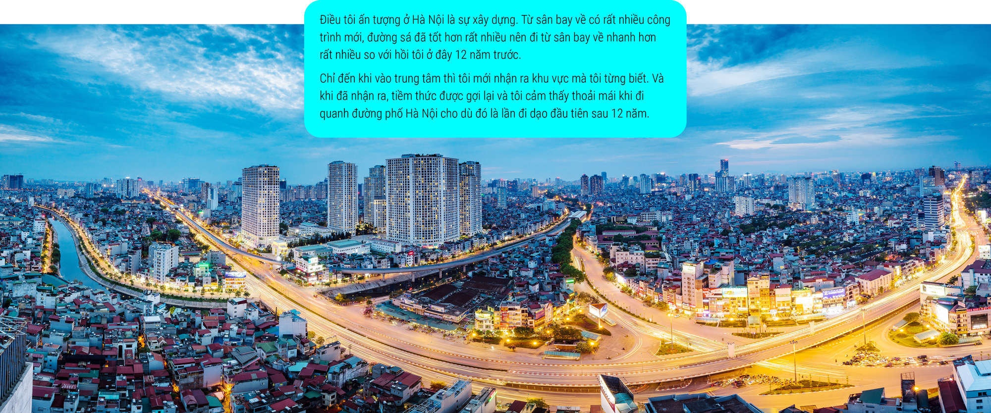 - Chuyến bay của tôi đến Việt Nam hạ cánh ở TP.HCM trước, lúc đó trời nắng và nóng. Rồi tôi đổi máy bay để ra Hà Nội. Khi tôi đến Hà Nội thì, như mọi khi, Hà Nội luôn bị bao phủ bởi mây mờ.