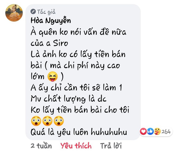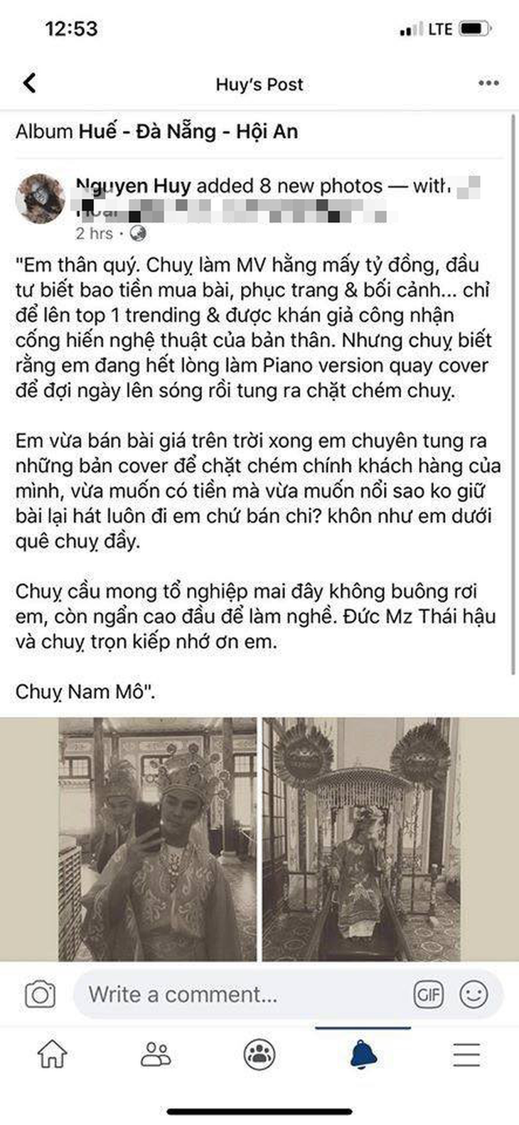 Cụ thể, nam ca sĩ trên đã đăng tải một bức hình chụp lúc du lịch ở Huế kèm với caption lấy ý từ chính bức thư "đánh ghen" mà nhân vật "Nam Phương hoàng hậu" Hoà Minzy gửi cho nhân vật Lý Lệ Hà trong MV. Tuy nhiên, câu cú được sửa đổi lại mang tính châm biếm khá rõ nét để ám chỉ một nghệ sĩ đã bỏ ra hàng tỉ đồng để mua bài hát, thực hiện một MV đầy tâm huyết, đạt đến top 1 trending để được khán giả công nhận cống hiến của bản thân.
