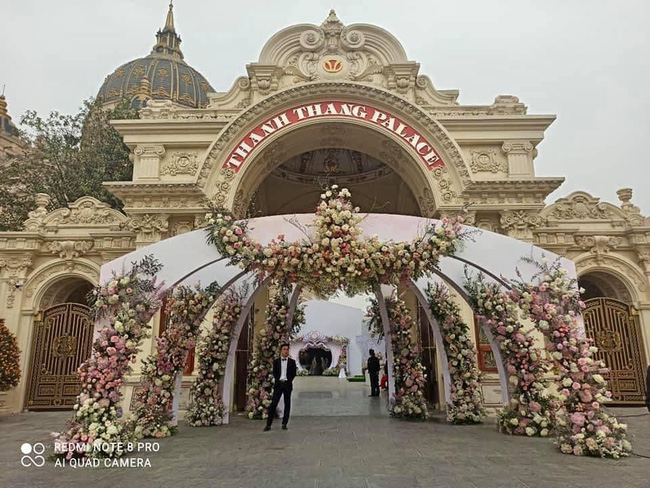 Cổng chào đám cưới phủ đầy hoa tươi trước tòa lâu đài khủng. (Ảnh Facebook)