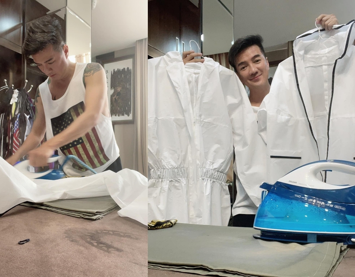 Nam ca sĩ cho biết, bộ đồ bảo hộ khá to và rộng so với vóc dáng của anh nên anh đã nhờ bàn tay NTK Tuấn Trần chỉnh trang lại cho vừa vặn. Ngoài ra, nam ca sĩ cũng không quên chuẩn bị luôn trang phục diễn cho bạn thân Vũ Hà trong sự kiện này.