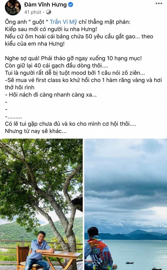 Tối 5-12, trên trang cá nhân của mình, Đàm Vĩnh Hưng đã tuyên bố "tháo gỡ ngay xuống 10 hạng mục" kén chọn người yêu. Sở dĩ nam ca sĩ chịu hạ giá là vì bị người bạn thân thiết là đạo diễn Trần Vi Mỹ đã mắng thẳng mặt: "Kiếp sau mới có người yêu nha Hưng nếu cứ giữ khư khư "cái list 50 mục yêu cầu khắt khe" để "tuyển người yêu"".