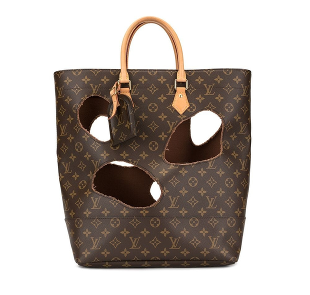 Cận cảnh chiếc túi thủng cả mảng vô cùng thu hút của nhà mốt Louis Vuitton.Được biết, đây là thiết kế trong bộ sưu tập kết hợp giữa nhà mốt đình đám của Pháp và Comme Des Garçons - một thương hiệu thời trang Nhật Bản. Nhiều dân mạng cũng cho rằng, việc "lạ hóa" và "bình dân hóa" hàng hiệu của các thương hiệu lớn trên thế giới đã không quá hiếm. Dù sở hữu diện mạo có phần khác so với chuẩn mực của một món hàng hiệu, song mức giá trên trời luôn khiến tín đồ thời trang phải ngẫm nghĩ, đắn đo.
