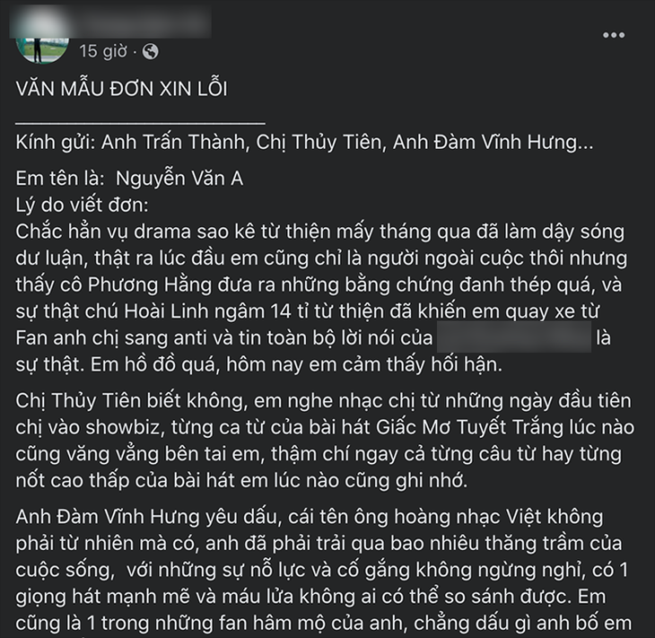 Dân mạng lan truyền 'Đơn xin lỗi mẫu' gửi Trấn Thành, Thủy Tiên