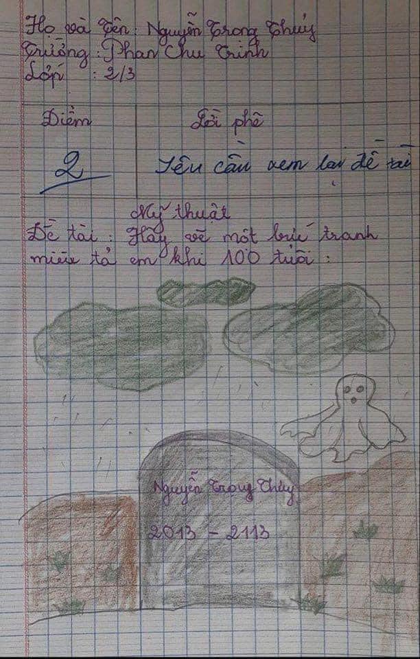 Đề bài yêu cầu vẽ em khi 100 tuổi. Nhưng mấy ai sống nổi đến tuổi 100, và cậu bé Trọng Thuỷ cũng chẳng sai khi dự đoán rằng bản thân đã mồ yên mả đẹp vào năm 2113 ở thì tương lai.- Vẽ đúng rồi mà, sao được chấm có 2 điểm vậy? Ai sống nổi tới 100 tuổi...
