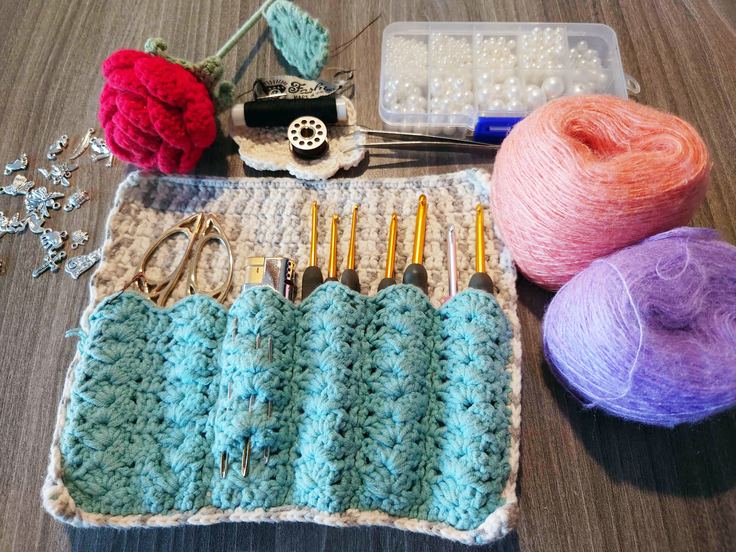 Một kênh TikTok với hơn 178.000 người theo dõi đang rao bán combo cho người mới học, gồm 5-10 cuộn len nhiều màu, kim móc, bông gòn, thước đo, ghim đánh dấu, kim khâu và kéo cắt len.