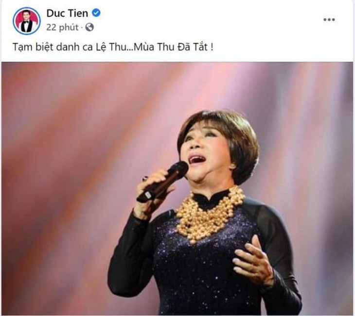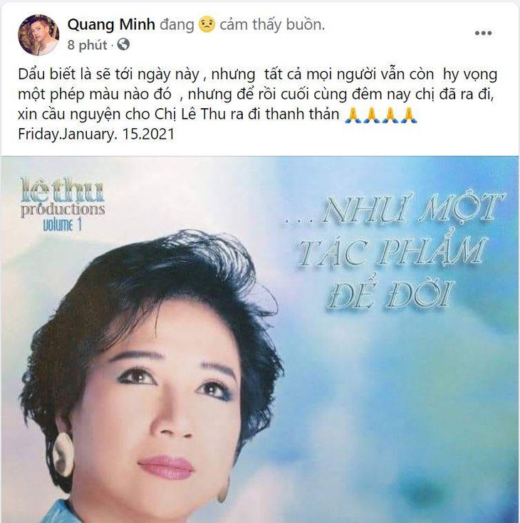 Dàn sao Việt thương tiếc trước sự ra đi của Lệ Thu11h ngày 16-2 (giờ Việt Nam), ca sĩ Jimmy Nhựt Hà đã thông báo tin buồn về việc nữ danh ca Lệ Thu qua đời ở tuổi 78 vì nhiễm COVID-19. Anh cho biết: "Sau một thời gian chống chọi với cơn bạo bệnh, nữ danh ca Lệ Thu đã được Chúa gọi về lúc 7:00pm, ngày 15 tháng 1 năm 2021 (giờ địa phương tại Mỹ ). Từ đây, "nước mắt mùa thu" sẽ thôi khóc thân phận mình. Được sự ủy quyền của gia đình, Jimmy sẽ cập nhật ngày giờ tang lễ trong thời gian sớm nhất".