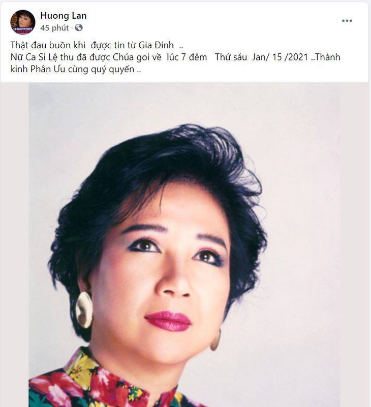 Danh ca Hương Lan cũng bùi ngùi. Bà đã nghe tin danh ca Lệ Thu cấp cứu vì nhiễm COVID-19 nhưng trong lòng bà vẫn nghĩ "còn nước còn tát". Thế nhưng cuối cùng người đồng nghiệp đáng kính của bà đã không thể vượt qua ải tử thần.