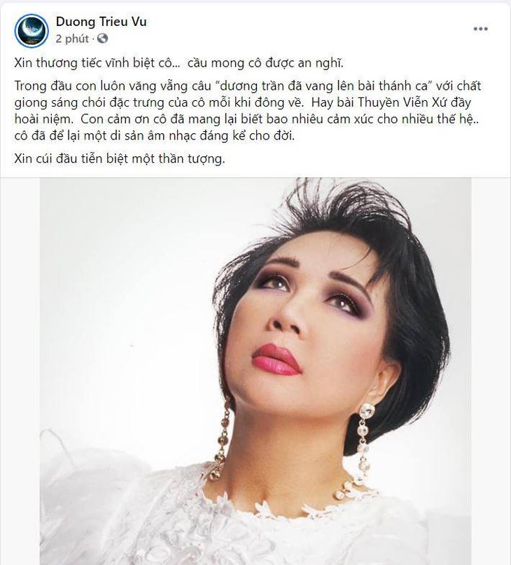 Con cảm ơn cô đã mang lại biết bao nhiêu cảm xúc cho nhiều thế hệ. Cô đã để lại một di sản âm nhạc đáng kể cho đời. Xin cúi đầu tiễn biệt một thần tượng".