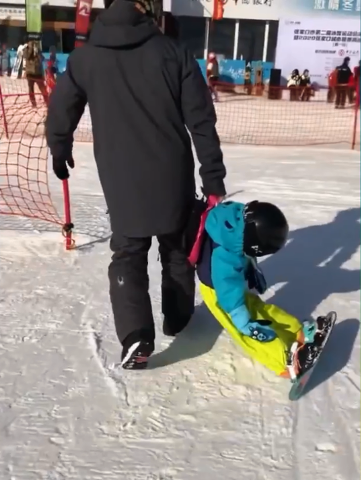 Đang trượt tuyết thì ngủ gật, cậu bé được bố kéo lê trên sân tuyết