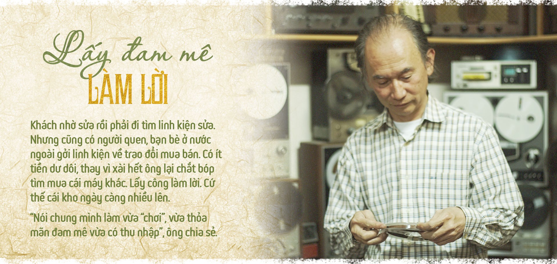 "Ba tôi là người kỹ tính. Ông hay giữ đồ cho khách. Có những cái máy ông sửa từ trước năm 1975 đến giờ vẫn còn. Thay vì vứt đi ông tiếp tục giữ nên số lượng máy rất nhiều. Tôi cũng theo đó, vẫn giữ vì biết đâu một ngày nào đó chủ những chiếc máy hát lại đến lấy", ông chia sẻ.