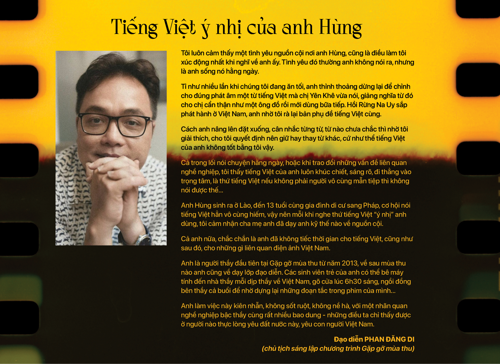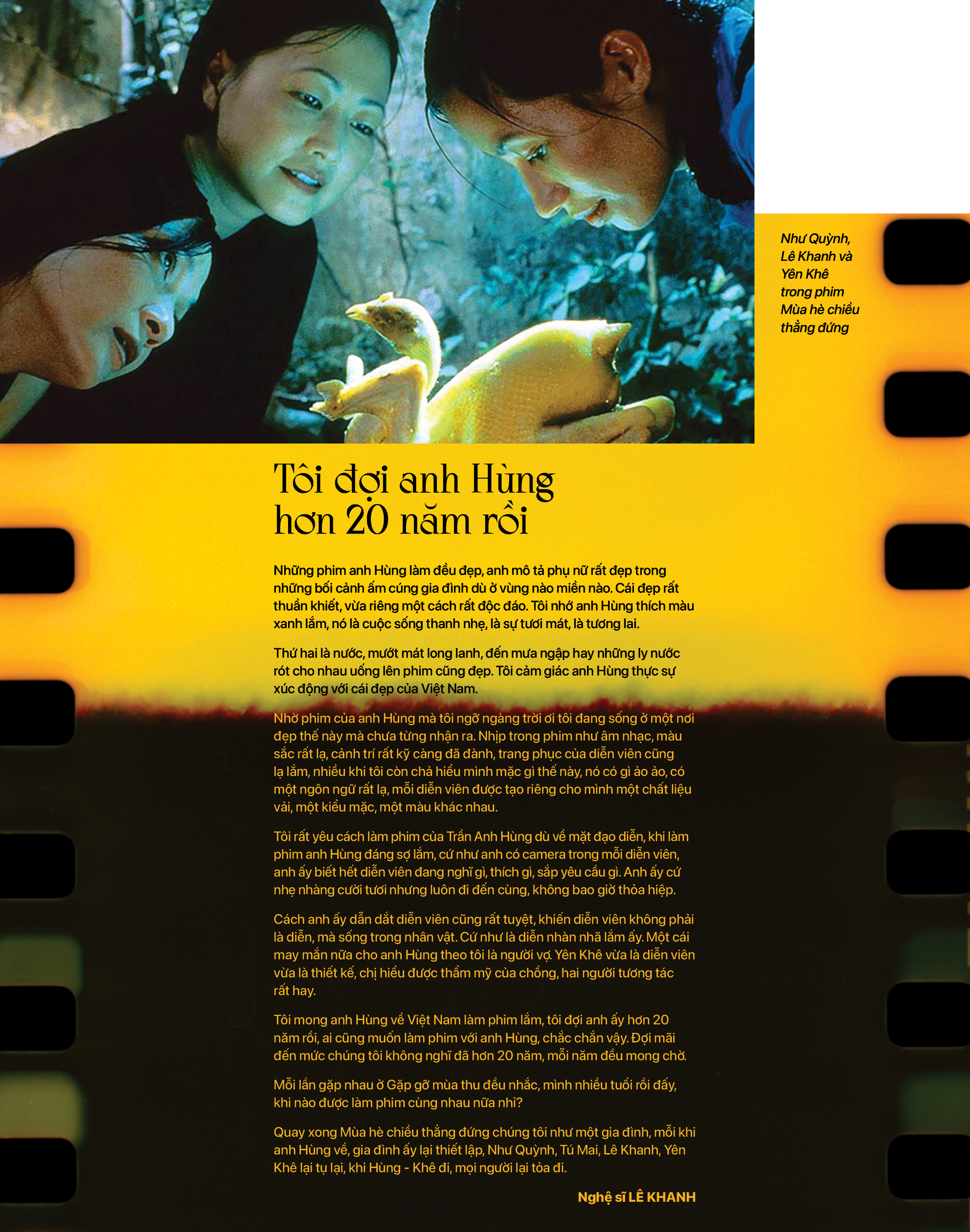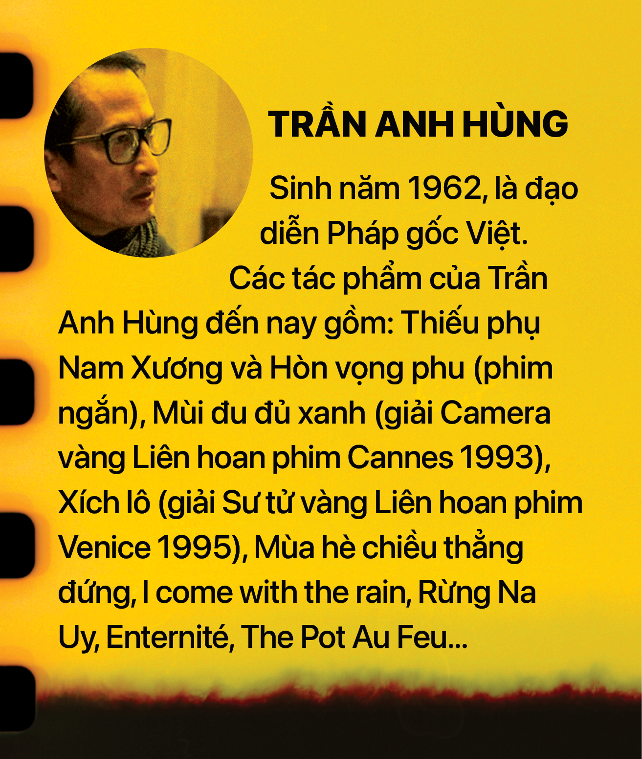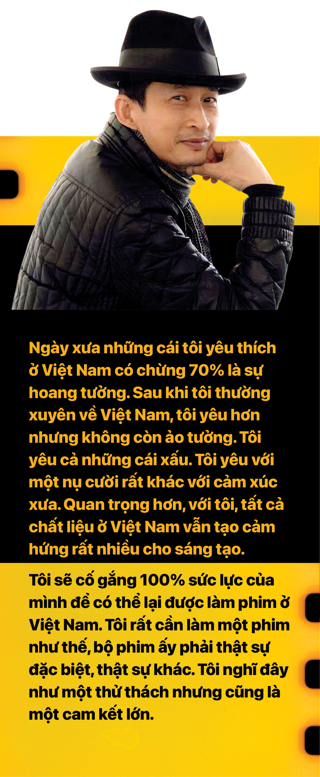* Tôi nhớ khi anh mời cha của mình xem Xích lô ở Venice, rồi hỏi ông thấy sao. Ông đã nói ông phải xem lần nữa bởi khi tiếng Việt vang lên giữa rạp chiếu phim, nước mắt ông cứ thế chảy ra... 4 phim gần đây nhất của anh đều nói ngôn ngữ không phải tiếng Việt. Cha anh cũng đã mất. Tiếng Việt của phim Trần Anh Hùng khi nào sẽ lại vang lên để chạm vào những người xa xứ lâu năm như cách ấy nữa?