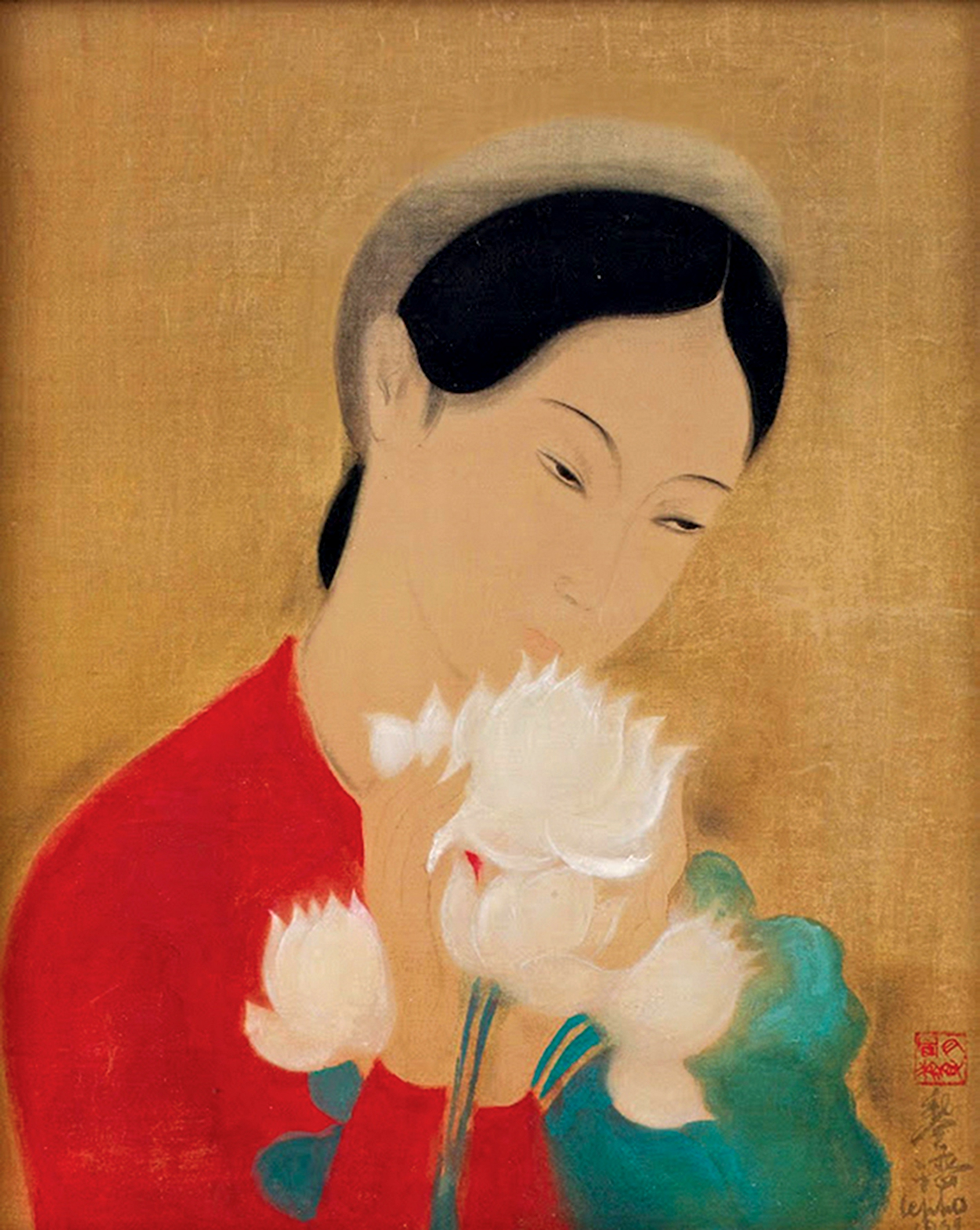 Hình như Lê Phổ chỉ dùng nhàn chương "明 月 青 身" (Minh nguyệt thanh thân/Thanh khiết như ánh trăng), dấu vuông, dương văn, đơn biên, thấy trên bức Thiếu phụ với hoa sen, và ở đây có lẽ do tác giả sơ ý nên đã đóng dấu nằm ngang [xoay phải 90 độ sẽ đúng].
