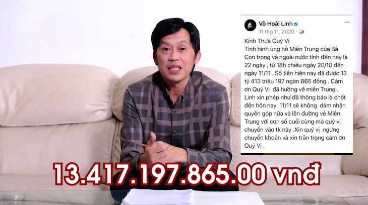 Ngày 11-1-2021, trên tài khoản cá nhân tôi đã đăng lên với số tiền là 13 tỉ 417 triệu 197 ngàn 895 đồng. Hiện tại, tôi đã liên hệ với địa phương để làm công việc của mình cho đến khi hết số tiền quý vị gửi đến. Số tiền này đã gửi đến đúng người, đúng đối tượng là những đồng bào bị thiên tai lũ lụt vừa qua. Sau lần báo cáo này, tôi sẽ có lần báo cáo nữa với đầy đủ chứng từ khi tôi đến trao tiền, khi đó sẽ có những kí xác nhận của chính quyền sở tại.