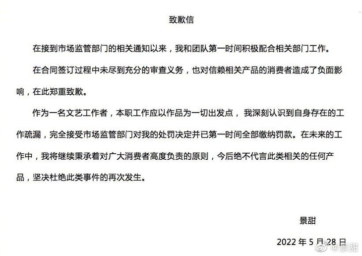 Trong công việc tương lai, tôi sẽ tiếp tục giữ vững nguyên tắc chịu trách nhiệm cao trước đông đảo người tiêu dùng và tôi cũng sẽ không bao giờ "chứng nhận" cho bất kỳ sản phẩm nào như vậy. Tôi đồng thời cũng kiên quyết ngăn chặn những sự cố như vậy tái diễn”, Cảnh Điềm thông qua Weibo lên tiếng xin lỗi.
