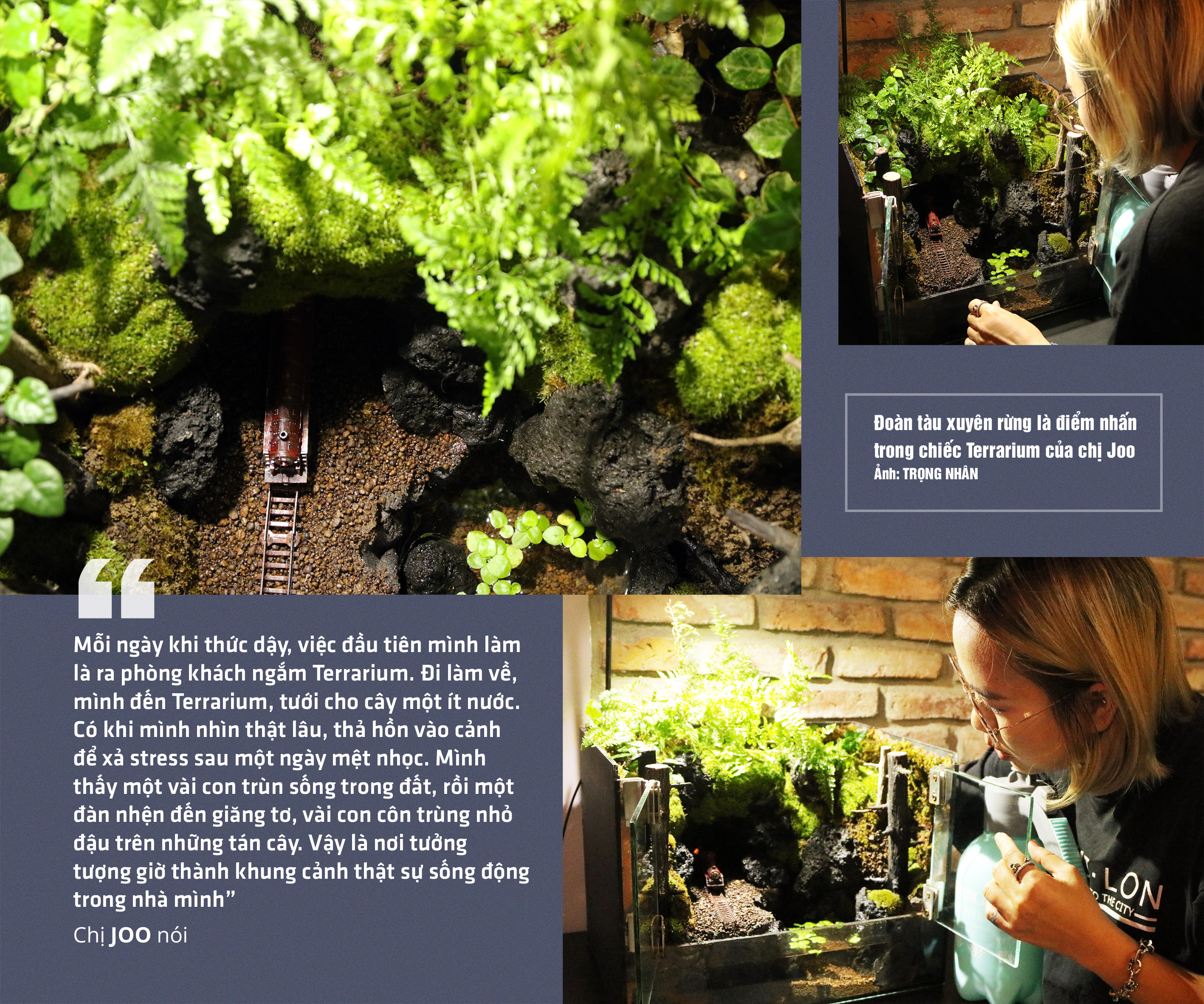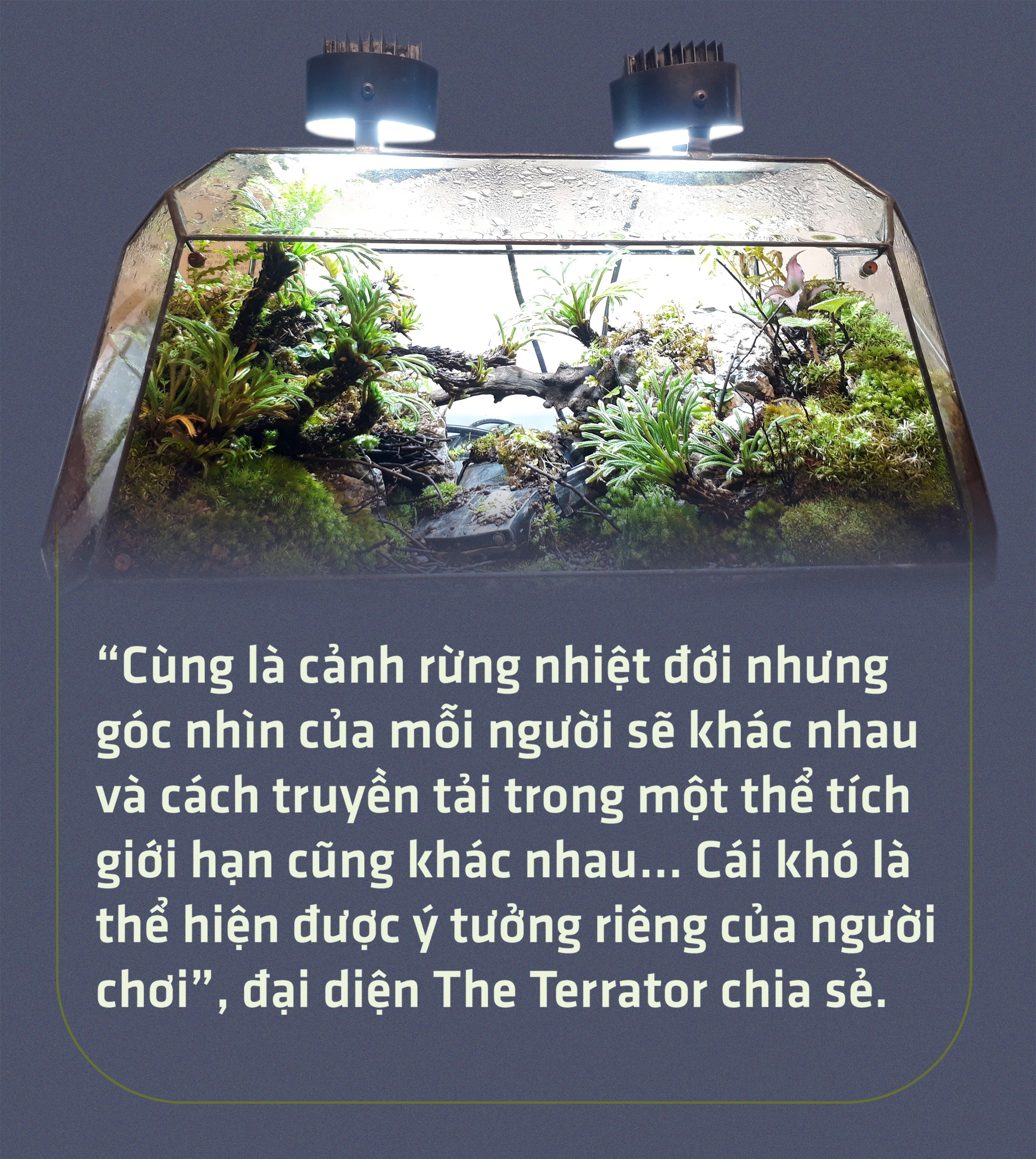 "Làm các tác phẩm đòi hỏi bạn phải yêu, mở lòng và thả hồn với thiên nhiên. Khi đang bực bội, bạn không thể sắp đặt các tiểu cảnh có hồn được. Chơi Terrarium, bạn có điều kiện sống chậm hơn, sâu hơn, có điều kiện nuôi dưỡng tâm hồn mình hơn", anh Phong nói.