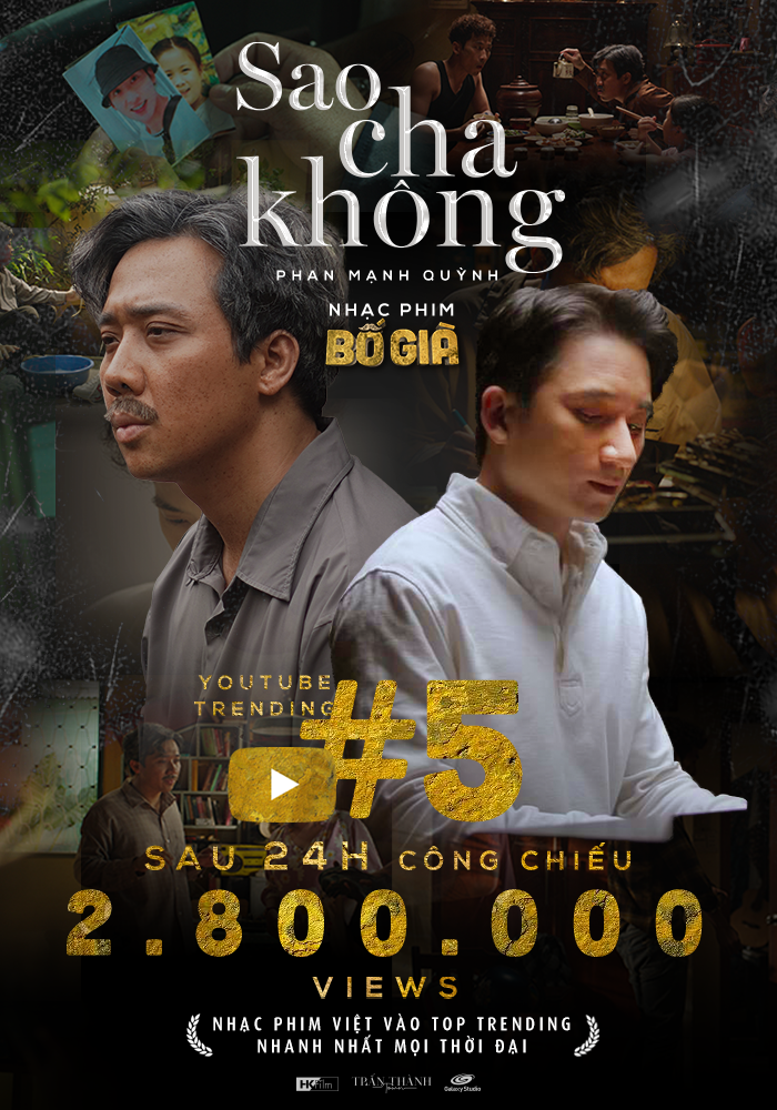 MC Sao cha không đã lọt Top 5 Trending YoutubeBố già dường như đang gắn với việc tự xô đổ kỷ lục của chính mình. Mới đây MV nhạc phim Sao cha không đã lọt vào Top 5 trending trên YouTube với hơn 2,8 triệu lượt xem sau đúng 24 tiếng công chiếu.