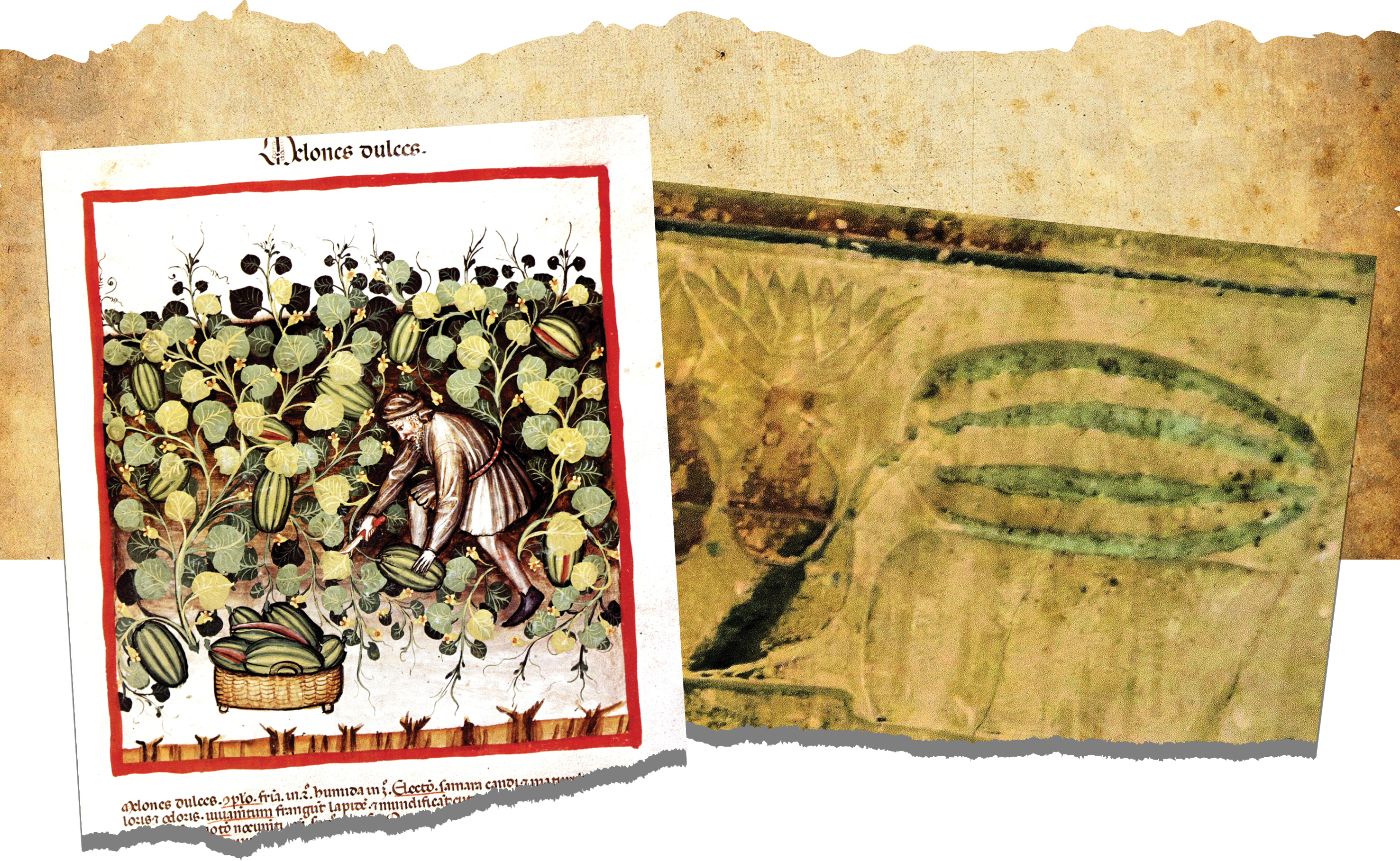 Hình vẽ dưa hấu tìm thấy trên vách hầm mộ ở Ai Cập hơn 4.000 năm trước (phải) và dưa hấu được vẽ trong sách Tacuinum Sanitatis thế kỷ 14 (trái)
