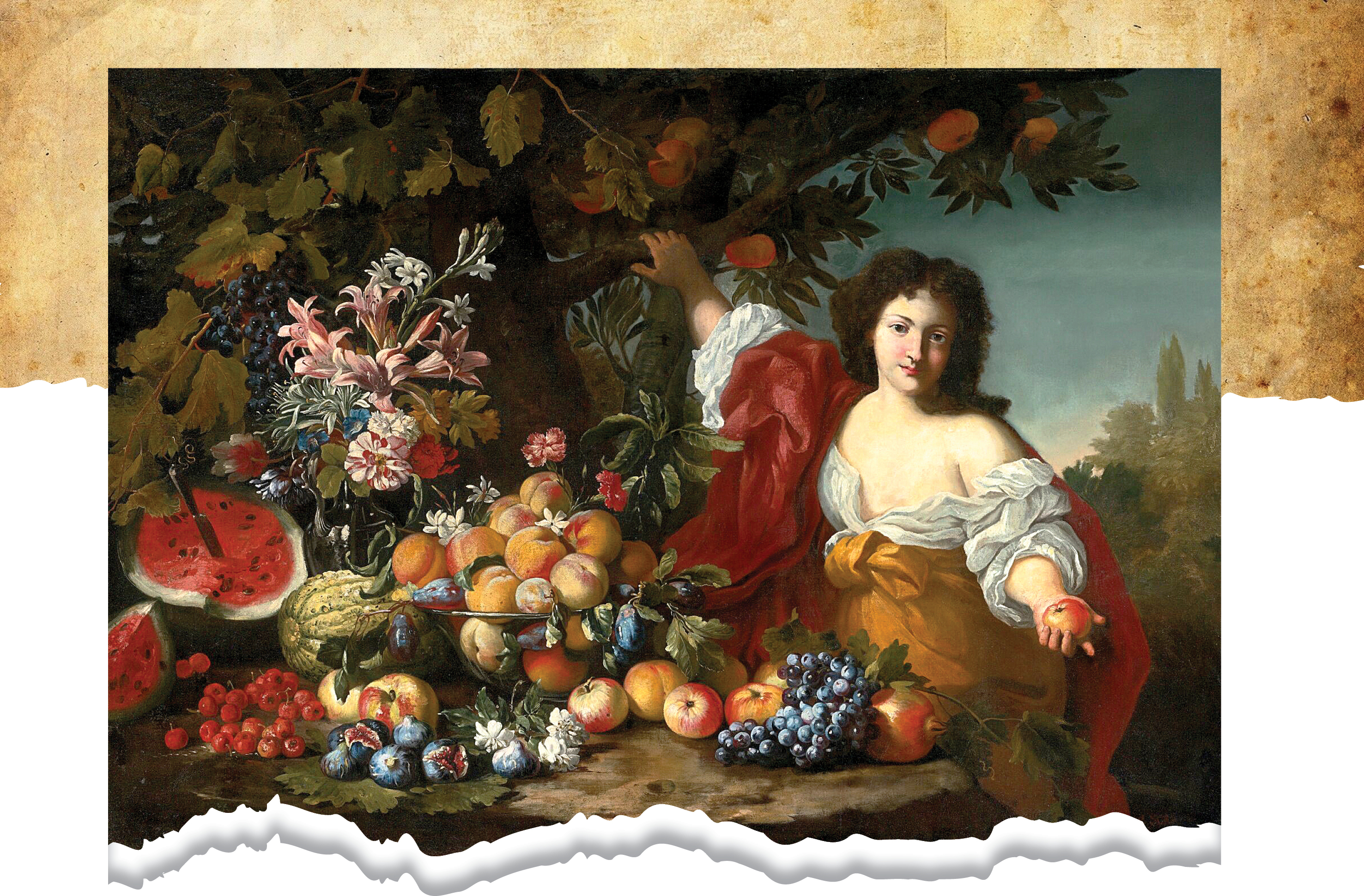 Và thứ trái cây này trông có vẻ ngọt ngào hơn trong Still life of fruits and flowers with a figure (Bức tĩnh vật hoa trái với một phụ nữ) được họa sĩ người Flemish Abraham Brueghel (1631 - 1690) và họa sĩ người Ý Guillaume Courtois (1628 - 1679) cùng nhau vẽ vào khoảng năm 1650 - 1697. Đó là một quả dưa hấu có ruột đỏ mọng và lớp vỏ thì khá dày.