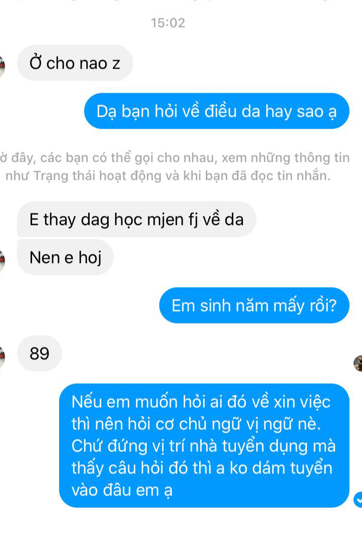 Mới đây, một chủ spa chăm sóc da tại Nha Trang đã đăng tải đoạn chat giữa anh và một ứng viên lên trang cá nhân, làm dấy lên tranh cãi về việc giao tiếp của người trẻ. Theo chia sẻ của anh chủ spa, việc không chào hỏi đôi khi cũng do bạn quá vô tư; thế nhưng, ngay cả vấn đề cơ bản nhất bạn không làm được, thì bạn sẽ thực hiện công việc thế nào?!