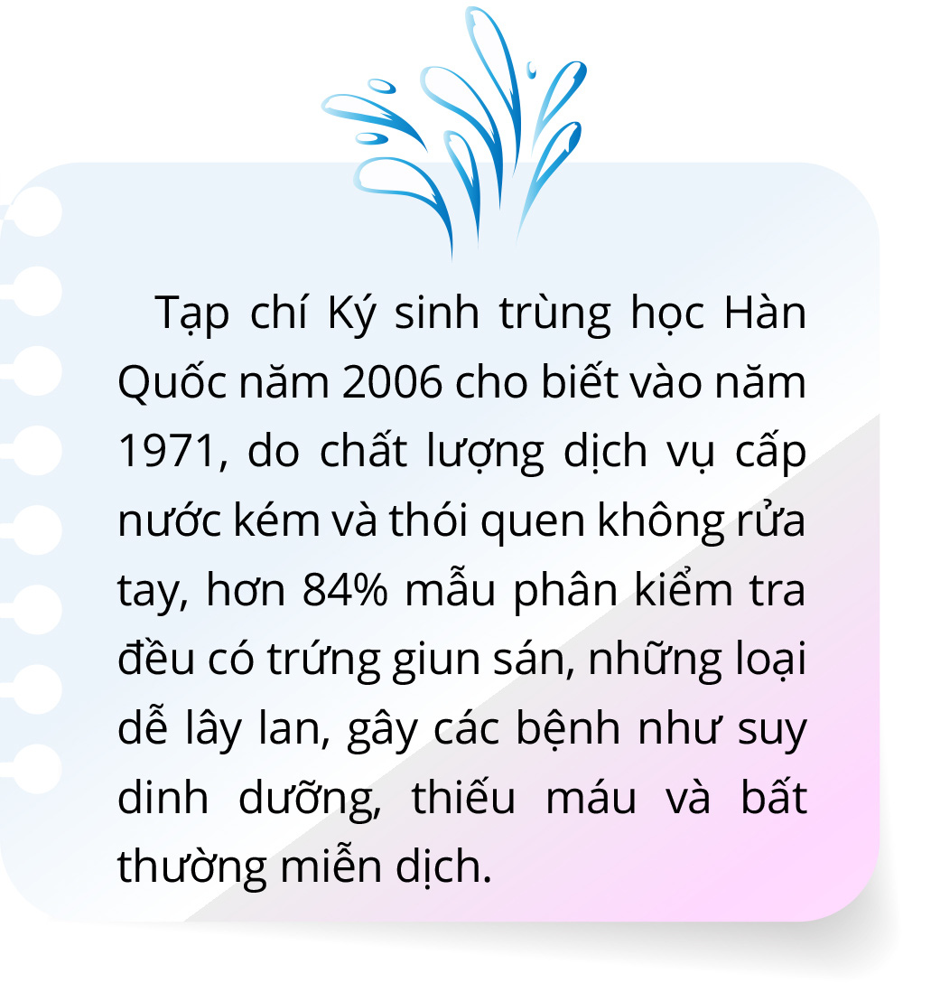 Năm 1962, chỉ 18% người dân Hàn Quốc được dùng nước máy (năm 2019, tỉ lệ này ở Việt Nam đang là 52%, số liệu của Tổng cục Thống kê). Khi đó Hàn Quốc thậm chí chưa có một hệ thống cống rãnh tiêu thoát nước, chứ đừng nói hoạt động thu gom hay xử lý nước thải - tất cả chỉ xuất hiện từ giữa những năm 1970.