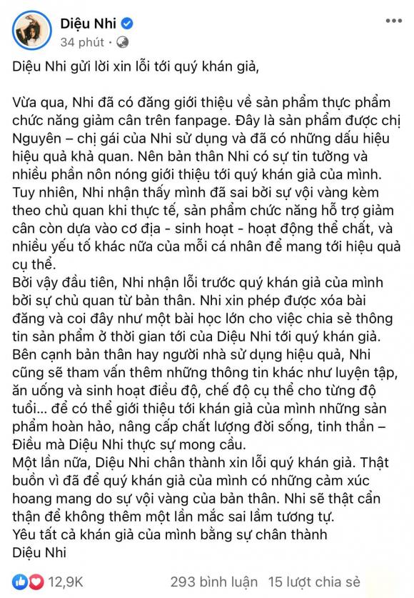 Bởi vậy đầu tiên, Nhi nhận lỗi trước quý khán giả của mình bởi sự chủ quan từ bản thân. Nhi xin phép được xóa bài đăng và coi đây như một bài học lớn cho việc chia sẻ thông tin sản phẩm ở thời gian tới của Diệu Nhi tới quý khán giả.
