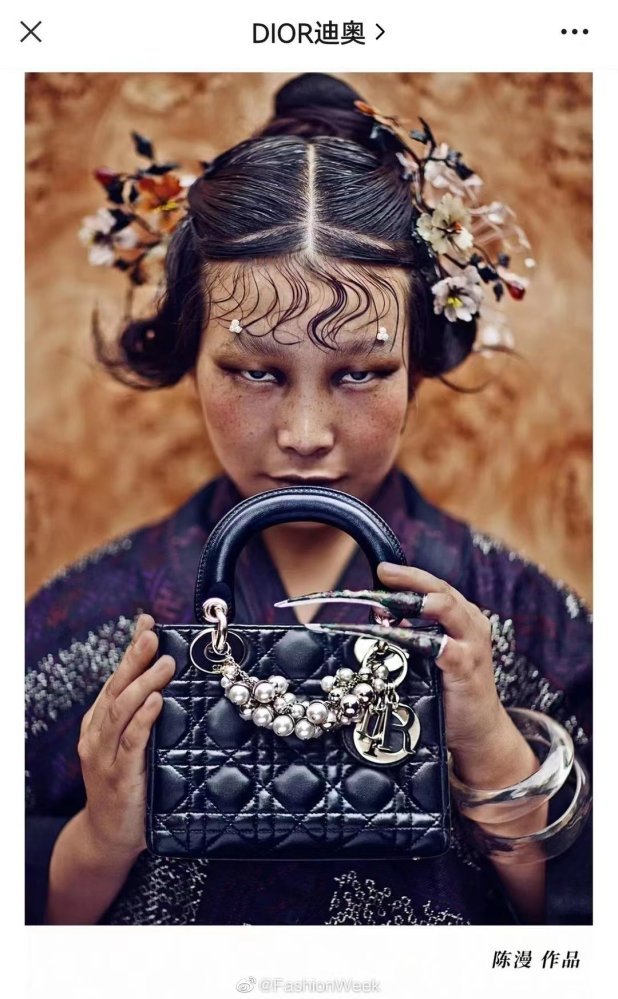 Bức ảnh nằm trong triển lãm Lady Dior được tổ chức tại Trung tâm Nghệ thuật Tây Bến Thượng Hải, cho thấy một phụ nữ gốc Á mặc trang phục truyền thống và cầm một chiếc túi Lady Dior. Trang Beijing Daily đăng lại ảnh này với dòng tiêu đề: "Đây có phải là người phụ nữ châu Á trong mắt Dior?".