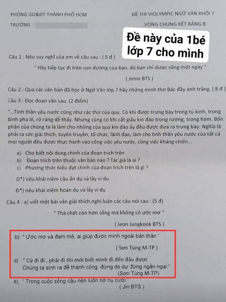 Trước đây, Sơn Tùng M-TP hay nhóm nhạc Hàn Quốc BTS cũng từng xuất hiện trong một đề thi Ngữ văn lớp 7. Ngay sau đó, đề thi này cũng "tạo sóng" dư luận, nhưng khen nhiều hơn chê khi đề thi đã và đang dần gần gũi hơn với nhịp sống của học sinh, sinh viên thế kỷ 21.