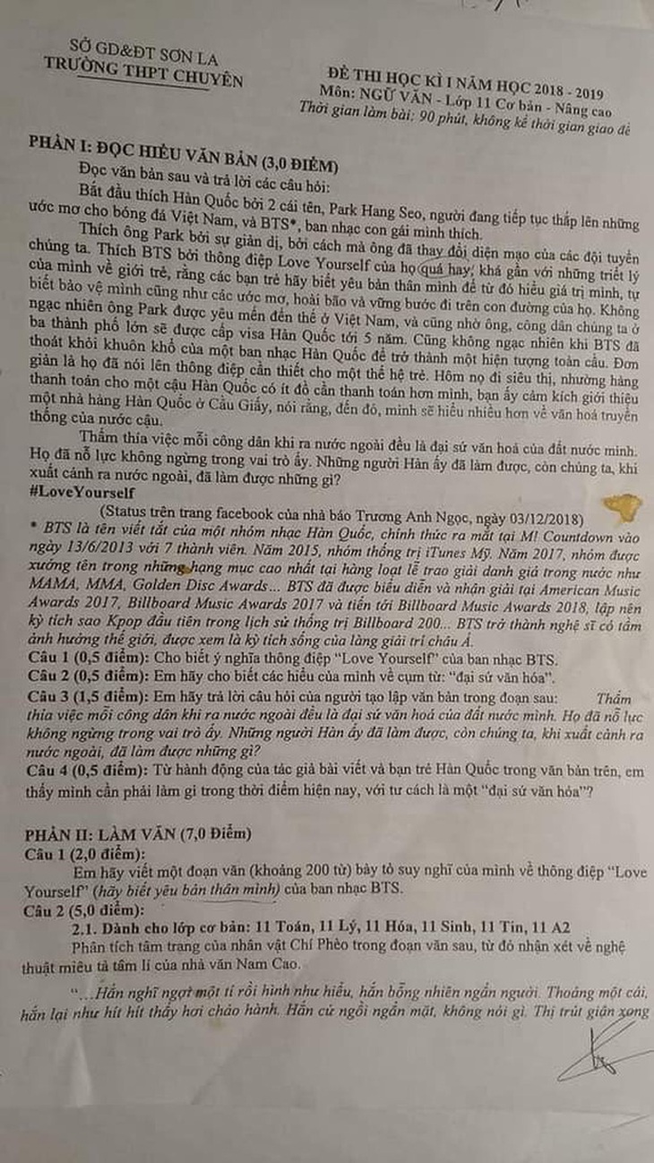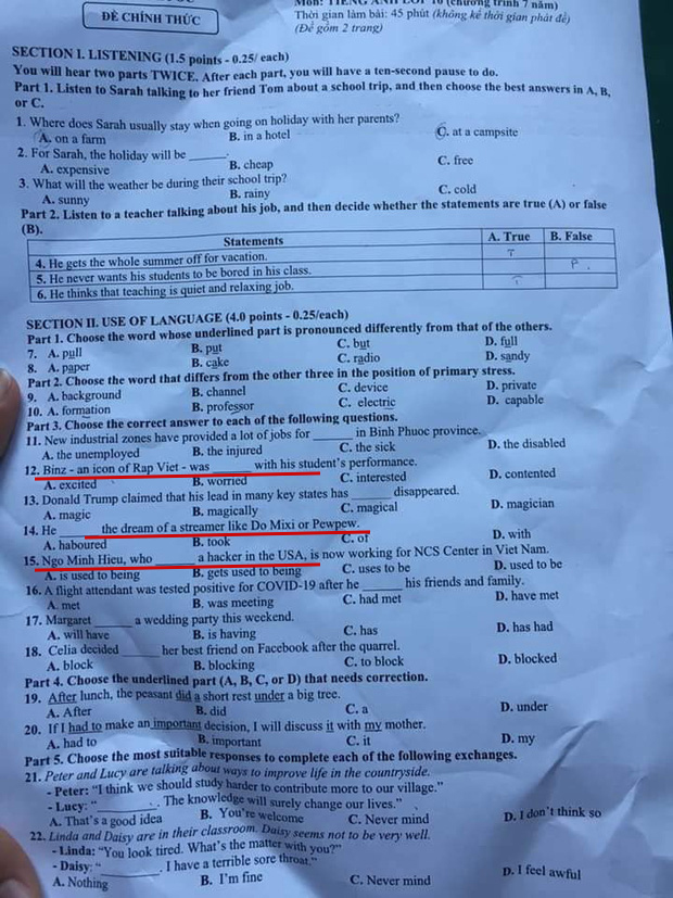 Đề thi những năm vừa qua liên tục xuất hiện nhiều điều thú vị, không còn quá khuôn mẫu như ngày trước. Mới đây, một đề thi tiếng Anh tại tỉnh Bình Phước gây bất ngờ với khoản "cập nhật" thế thái nhân tình vô cùng nhẹ nhàng, đưa hàng loạt câu hỏi có liên quan đến người nổi tiếng vào.