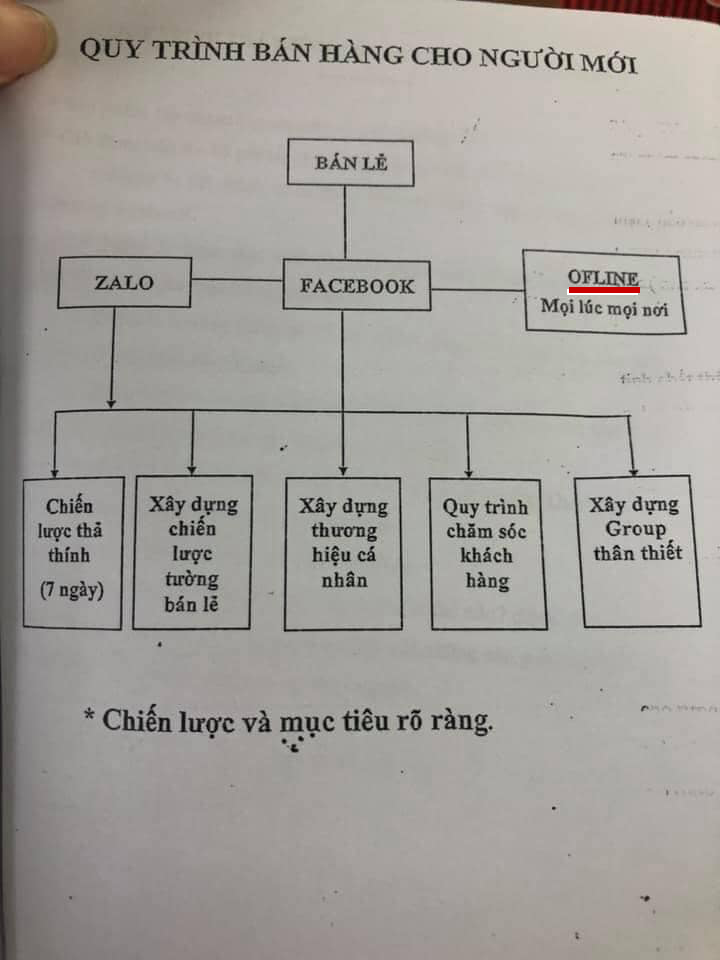 "Quy trình bán hàng" này được xây dựng dành cho những ai mới "nhập môn" kinh doanh kem trộn. Qua đó, bán lẻ được phân qua ba kênh: Zalo, Facebook và "Offline mọi lúc mọi nơi" - hiểu nôm na là gặp ai cũng mời, thấy ai có tiềm năng là chào mua.
