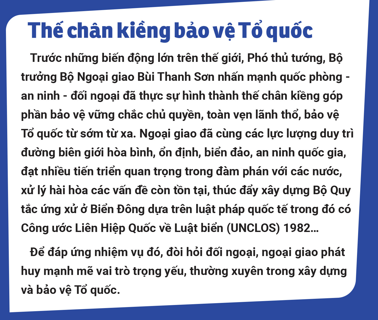 Lịch sử phát triển của nhân loại và bài học của các quốc gia đi trước cho thấy quốc gia nào muốn phát triển cũng đều cần trải qua thời kỳ vươn mình, bứt phá mà trong đó đối ngoại, ngoại giao có thể có những đóng góp quan trọng" - Phó thủ tướng, Bộ trưởng Bộ Ngoại giao BÙI THANH SƠN chia sẻ trong cuộc phỏng vấn với Tuổi Trẻ nhân dịp Tết Ất Tỵ.