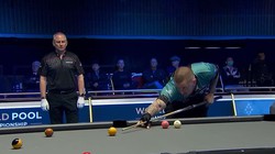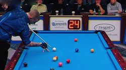 Cơ thủ Daniel Dagotdot cười mãn nguyện với pha giấu bi của mình nhưng không ngờ rằng đẳng cấp Jayson Shaw ở tầm khác.