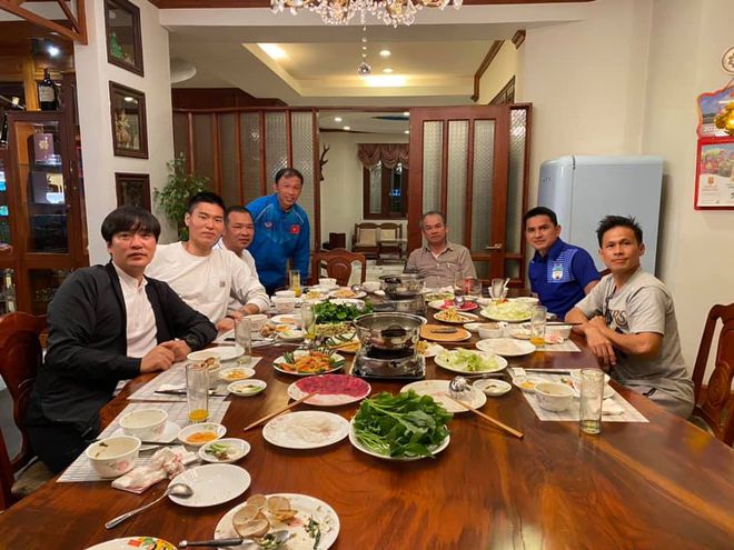 HLV Kiatisak trong dịp tất niên tại nhà bầu Đức. Ảnh: FBNV,Được thưởng thức tài nghệ của HLV người Thái Lan, bầu Đức khá vui và khẳng định thuyền trưởng HAGL nấu ăn khá ngon.