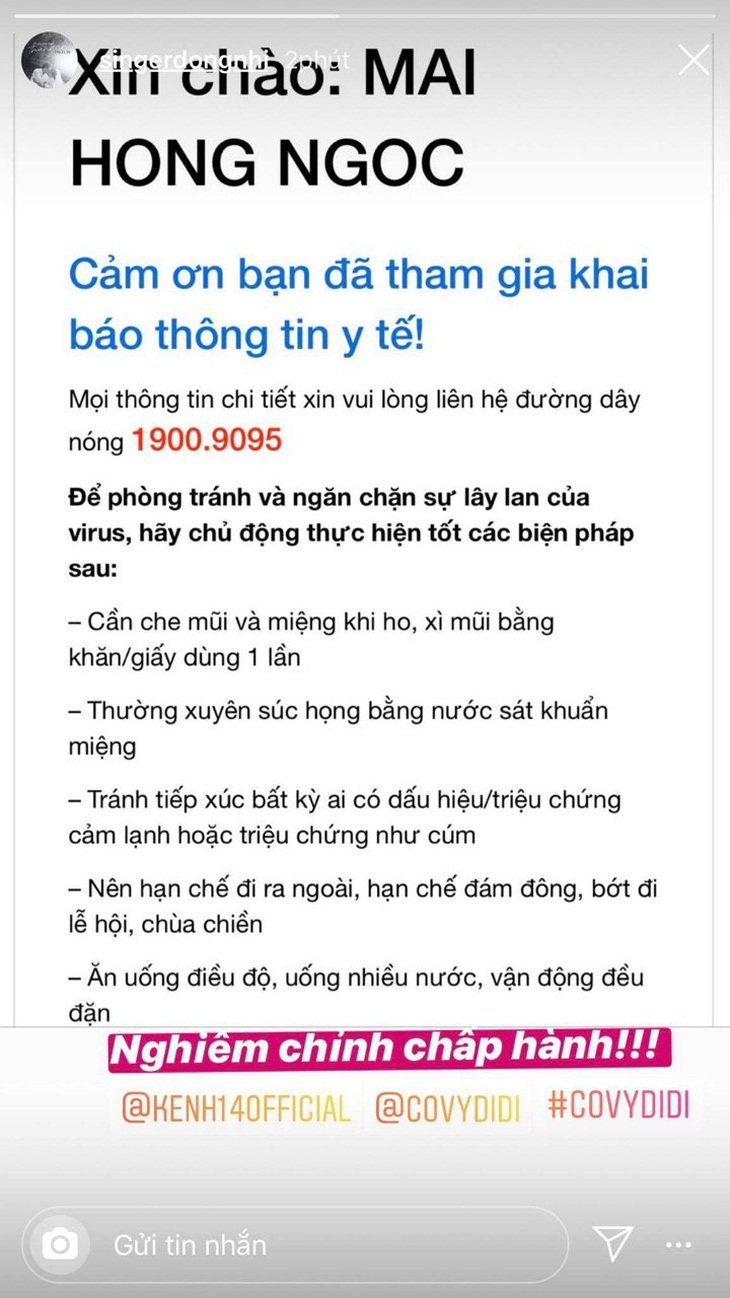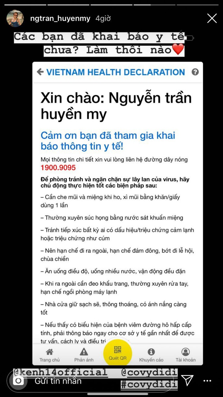 Một người đẹp nữa là á hậu Huyền My cũng rất quan tâm tới diễn biến của dịch bệnh Covid-19. Khai báo y tế là thử thách đầu tiên nàng Á hậu hoàn thành trong chiến dịch 14 ngày của Cô Vy đi đi. Huyền My cho biết cô thực hiện rất nhanh chóng, đơn giản, lại giúp cho cơ quan chức năng nắm bắt được tình hình của mỗi cá nhân để kiểm soát.