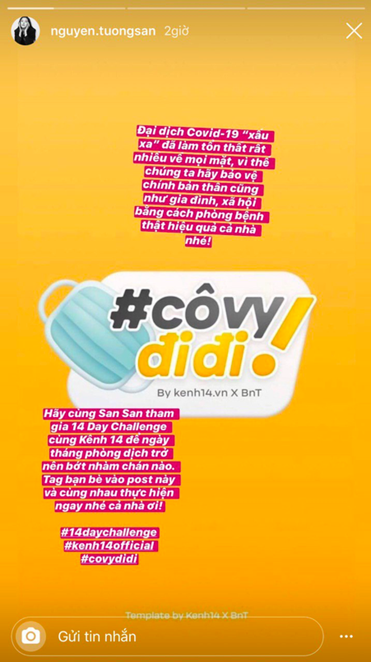 Hoa hậu Lương Thuỳ Linh kêu gọi mọi người cùng tham gia chiến dịch "Cô Vy đi đi"Á hậu Tường San là nhân vật tiếp theo sẽ góp mặt cùng thực hiện chuỗi thử thách 14 ngày với chiến dịch Cô Vy đi đi. Cô chia sẻ : "Đại dịch Covid-19 "xấu xa" đã làm tổn thất rất nhiều về mọi mặt, vì thế chúng ta hãy bảo vệ chính bản thân cũng như gia đình, xã hội bằng cách phòng bệnh thật hiệu quả cả nhà nhé!".