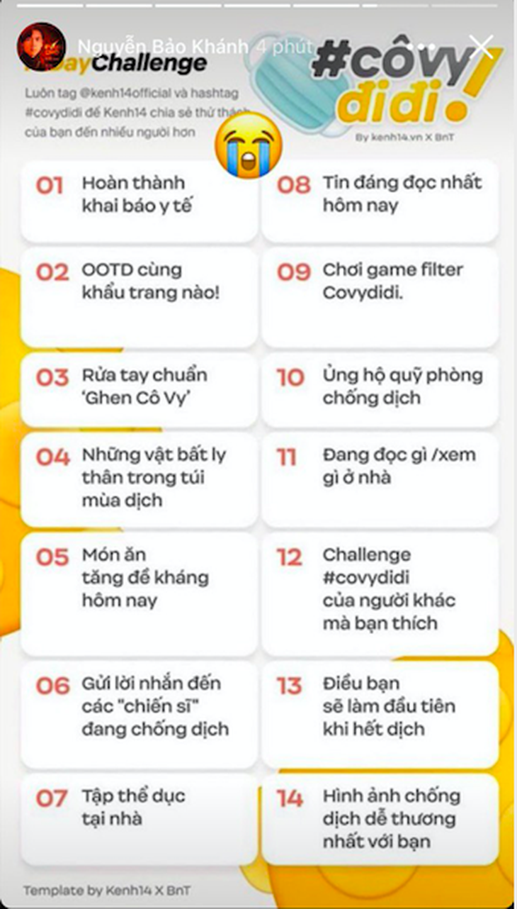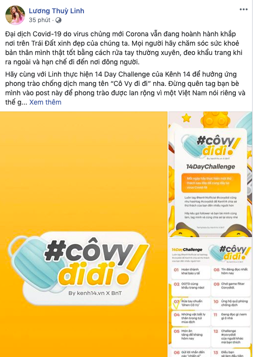 Hãy cùng với Linh thực hiện 14 Day Challenge để hưởng ứng phong trào chống dịch mang tên Cô Vy đi đi nha. Đừng quên tag bạn bè mình vào post này để phong trào được lan rộng vì một Việt Nam nói riêng và thế giới nói chung không còn dịch bệnh.