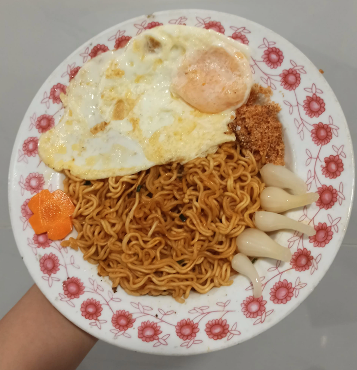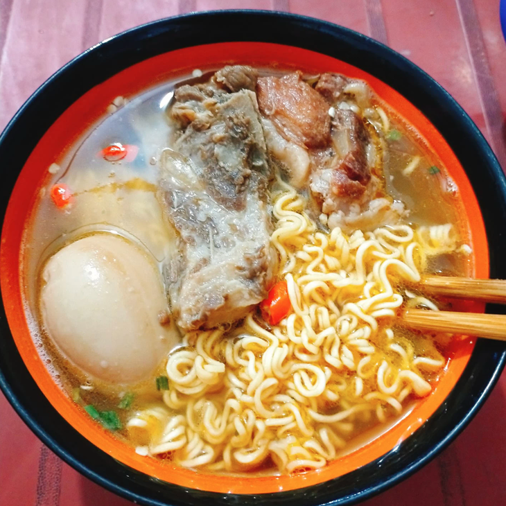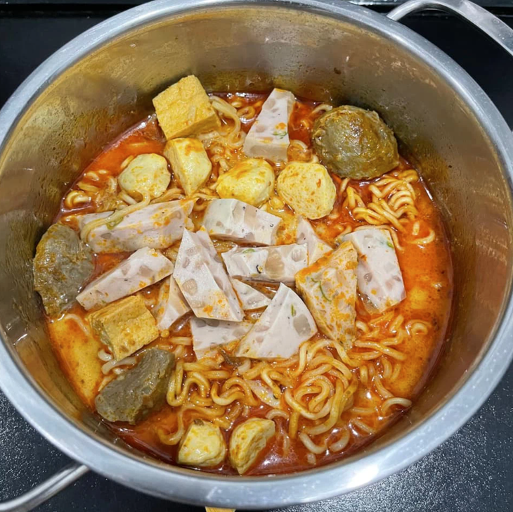 Đầu tiên là tuyển tập mì gói thập cẩm với đủ loại topping. Theo đó, những nguyên liệu thường có sẵn trong tủ lạnh dịp Tết như giò thủ, giò chả, thịt nguội, bò viên, cá viên, thịt kho hột vịt, hay củ kiệu, dưa chua... dễ dàng được tận dụng cho món này.