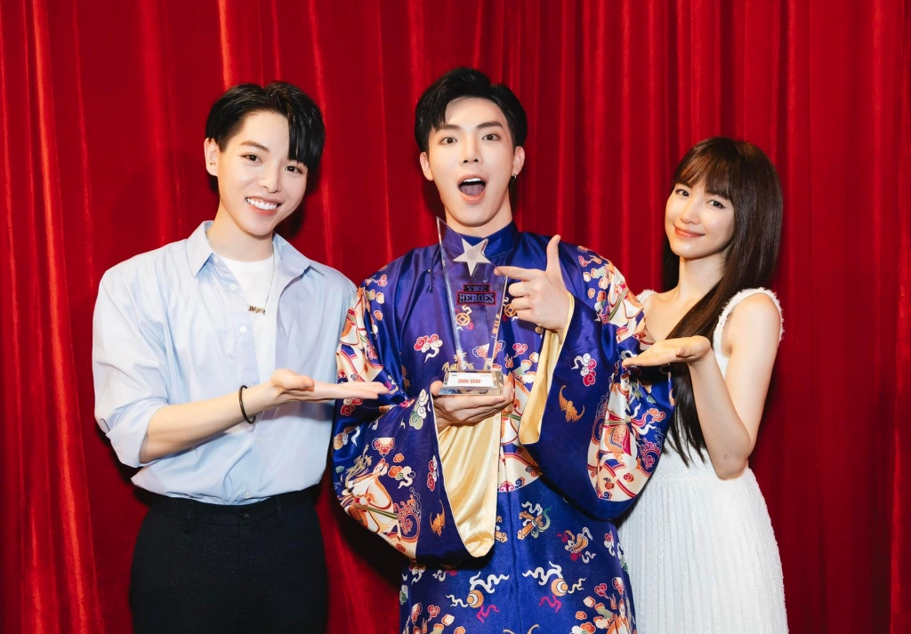 Hoà Minzy và Đức Phúc đồng hành cùng em út Erik trong giây phút vinh danh ngôi vị Quán quân.Đặc biệt, sau đêm chung kết chương trình The Heroes - Thần tượng đối thần tượng mùa đầu tiên vừa lên sóng tối 27-11, 2 thành viên Đức Phúc và Hòa Minzy chính thức chào đón cậu em út Erik gia nhập đội hình bạn thân toàn quán quân.