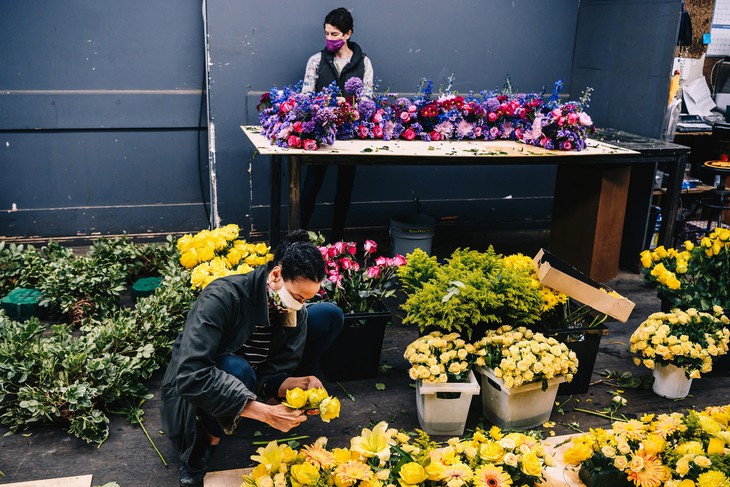 Các thành viên trong nhóm của Miller chuẩn bị hoa cho các tác phẩm sắp đặt trên đường phố New York.