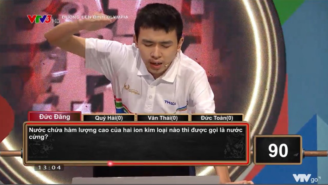 Cụ thể, câu hỏi đó trong phần thi khởi động của Bùi Đức Đăng là: "Nước chứa hàm lượng cao của hai ion kim loại nào thì được gọi là nước cứng". Đáp án đúng phải là "Canxi và Magie", trong khi câu trả lời của Đức Đăng là "Kali và Magie".