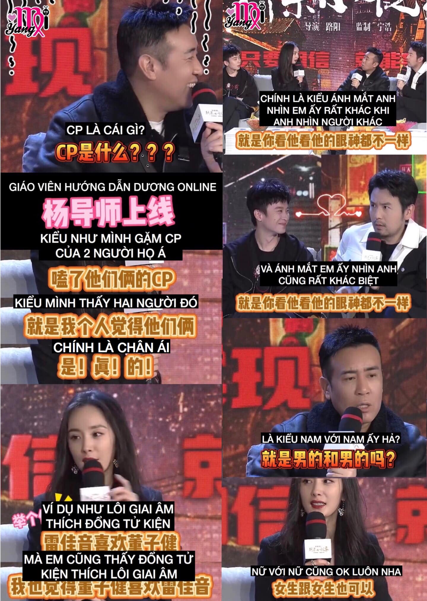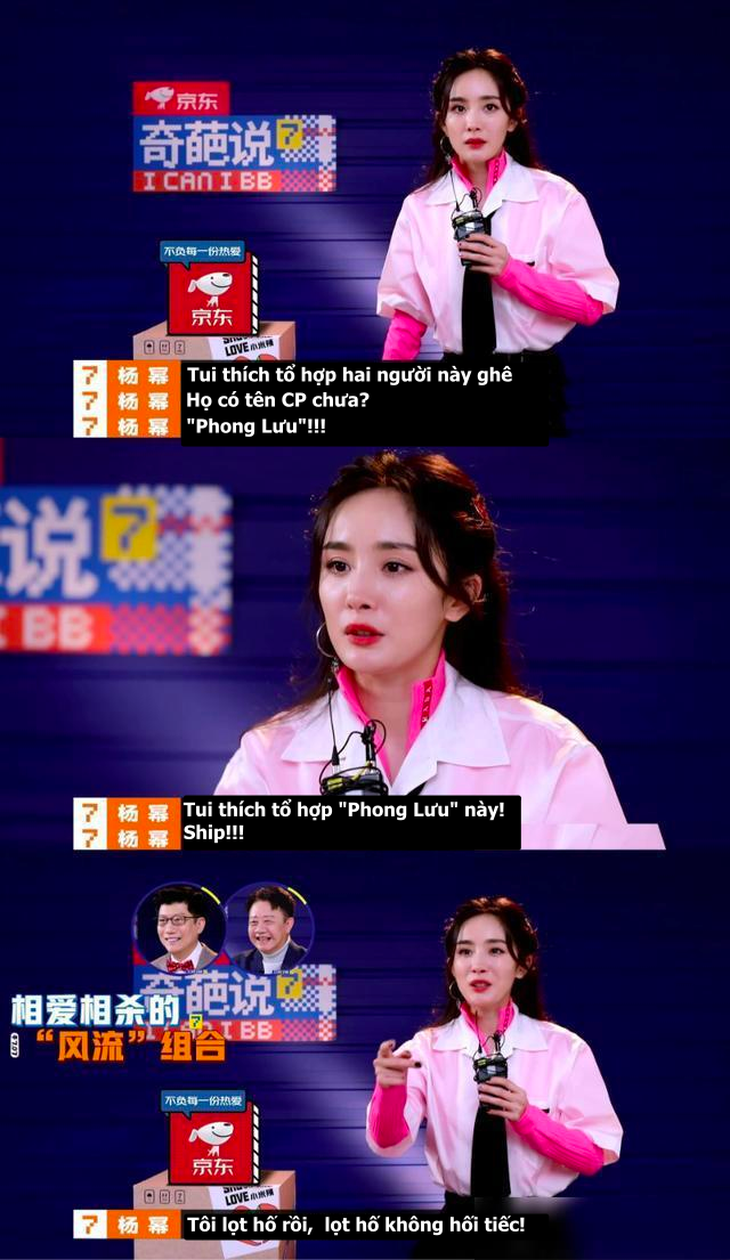 Chưa dừng lại ở đó, trong talkshow Kỳ ba thuyết mùa 7, Dương Mịch không ngần ngại khi ship couple nữ - nữ đó chính là hai khách mời khác là Tiết Triệu Phong và Lưu Kình. Thậm chí còn giúp họ đặt tên CP là “Phong Lưu”.