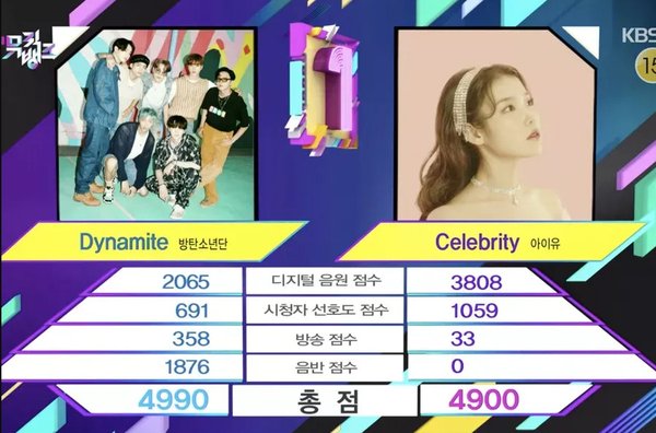 Cụ thể, trong show Music Bank vào chiều 5-3 siêu hit Dynamite của BTS đã vượt mặt ca khúc Celebrity của IU để giành No.1 của tuần này với 4.990 điểm, hơn 90 điểm so với bài hát của IU.