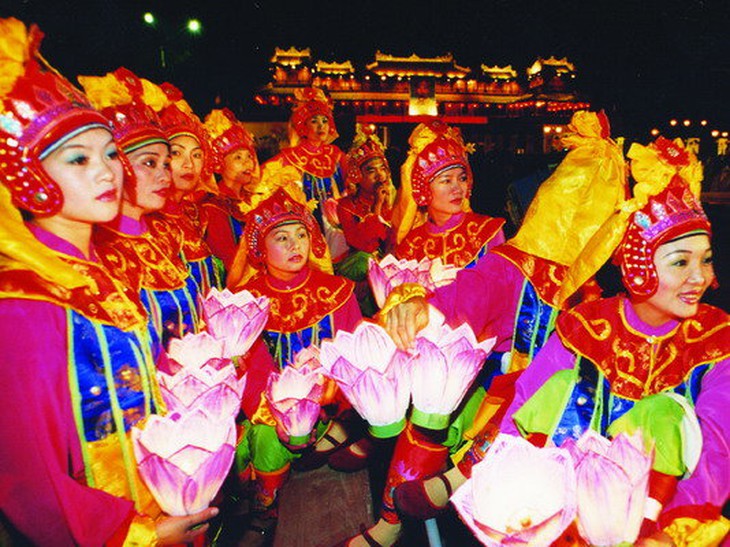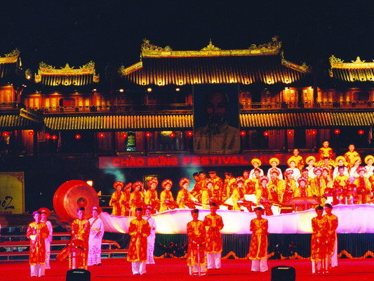 TTCN - Tuồng là một hình thức nghệ thuật sân khấu dân tộc đặc sắc tồn tại từ thời nhà Trần và phát triển rực rỡ vào thời Nguyễn. Năm 1627, Đào Duy Từ về với chúa Nguyễn. Cùng với thiên tài quân sự, ông còn mang đến cho chúa Sãi Nguyễn Phúc Nguyên một báu vật, đó là nghệ thuật tuồng. Phóng to Nhã nhạc cung đình Huế - Ảnh: Việt DũngTTCN - Tuồng là một hình thức nghệ thuật sân khấu dân tộc đặc sắc tồn tại từ thời nhà Trần và phát triển rực rỡ vào thời Nguyễn. Năm 1627, Đào Duy Từ về với chúa Nguyễn. Cùng với thiên tài quân sự, ông còn mang đến cho chúa Sãi Nguyễn Phúc Nguyên một báu vật, đó là nghệ thuật tuồng. Như vậy đến nay nghệ thuật tuồng đã tồn tại ở Huế được 376 năm. Thời Nguyễn, từ vua quan trong hoàng cung đến thần dân trăm họ đều say mê hát bội. Vua Minh Mạng thành lập hẳn một trường đào tạo diễn viên tuồng gọi là Thanh Bình Thự. Vua Tự Đức tổ chức hẳn một lực lượng sáng tác, đạo diễn tuồng do Đào Tấn đứng đầu. Vì thế, thời Nguyễn có tới bốn nhà hát được xây dựng, trong số đó hai nhà hát cung đình hiện vẫn còn. Nhà hát riêng của vua Thiệu Trị (1841-1847) và hoàng gia là Tịnh Quan Viên được xây dựng trong Tử Cấm Thành năm 1843, hiện chỉ còn dấu tích trên bản đồ. Minh Khiêm Đường là nhà hát nằm trong khu lăng Tự Đức, được xây dựng đầu năm 1865, để khi vua lên lăng ngự thì nghe tấu nhạc, xem diễn tuồng. Minh Khiêm Đường làm bằng gỗ, ba gian, hai chái, cao 8m, có sân khấu rộng, có chỗ cho vua ngồi, nay đã được trùng tu như cũ. Phóng toVua Khải Định cũng rất mê tuồng nên khi xây cung An Định (1917) cũng cho xây một nhà hát rất lớn (diện tích 1.500m2) gọi là Cửu Tư Đài, ở phía sau Khải Tường Lâu, kiến trúc bêtông cốt thép theo lối phương Tây, để làm nơi diễn tuồng cho hoàng gia xem. Nhà hát này đã bị sập năm 1947. Có một nhà hát lớn, nơi cả vua quan và triều thần cùng vào xem là Duyệt Thị Đường. Đây là nhà hát cổ nhất VN, hiện đã được trùng tu và đang được sử dụng phục vụ khách du lịch! Tại cuộc hội thảo Bảo tồn và phát huy giá trị tuồng cung đình Huế (tháng 7-2000), nhà văn hóa Phan Thuận An cho biết Duyệt Thị Đường là được xây dựng vào giữa năm Minh Mạng thứ 7 (1826), đến nay đã 177 năm tuổi. Đây là một tòa nhà bằng gỗ, lợp ngói lưu ly, bốn gian hai chái, tọa lạc trong một khuôn viên hình vuông có tường bao quanh. Sân khấu là phần sàn nhà nằm giữa bốn gian, khi diễn thì trải chiếu hoa lên sân khấu. Trần nhà hát được trang trí hình ảnh các vì tinh tú, những đám mây ngũ sắc, vầng trăng khuyết, nền trời xanh rất đẹp, tạo cho người diễn cũng như người xem cảm giác như đang ở ngoài trời, giữa cuộc đời. Nhà hát là nơi diễn tuồng và trình tấu âm nhạc cung đình. F.Baille (Pháp) mô tả một buổi vua vào xem ở Duyệt Thị Đường năm 1897 (dẫn theo Phan Thuận An): “Đức vua ngự trên long ỷ thì dàn nhạc giáo đầu gồm hai mươi nhạc sĩ ngồi xổm đánh trống, gảy đàn, thổi kèn... Trước mặt họ có một cái trống lớn... Một vị quan ngồi sau trống. Mỗi khi nghệ sĩ khéo trình diễn thì ông đánh hai hay ba tiếng trống, mỗi tiếng tiêu biểu một số tiền biếu tặng diễn viên...”. Duyệt Thị Đường được tu bổ nhiều lần dưới thời các vua Nguyễn. Năm 1962, khi chính quyền Sài Gòn cải tạo, sửa chữa Duyệt Thị Đường để làm cơ sở giảng dạy của Trường Quốc gia âm nhạc Huế, các công trình chung quanh bị triệt hạ để xây chỗ ở cho giáo viên và sinh viên, cấu trúc của nhà hát bị thay đổi không còn như cũ. Trải bao năm chiến tranh, thiên tai và cả sự vô ý thức của con người, Duyệt Thị Đường bị xuống cấp nghiêm trọng. Từ năm 1995 đến nay được sự trợ giúp của Chính phủ và các doanh nghiệp Pháp, Duyệt Thị Đường đã được đầu tư trên 10 tỉ đồng để trùng tu. Ngày 1-1- 2003, Duyệt Thị Đường đã chính thức mở cửa đón du khách vào xem Nhà hát nghệ thuật cung đình Huế biểu diễn các tác phẩm tuồng, âm nhạc và múa cung đình. Nhà hát còn mời các nghệ nhân Lê Văn Kích, bác Trần Hữu Thi... những người ở trong các đội nhạc lễ cung đình xưa tham gia đào tạo, chỉ dẫn lớp nhạc công lớp trẻ.