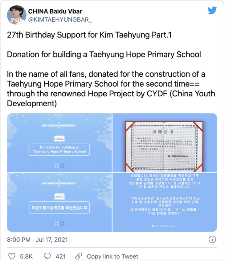 Với mục đích mừng sinh nhật lần thứ 27 (5-12) cho Kim Taehyung (V), fandom tại Trung Quốc của thành viên BTS mang tên China Baidu Vbar đã quyết xây dựng thêm một trường tiểu học dưới tên của nam thần tượng.