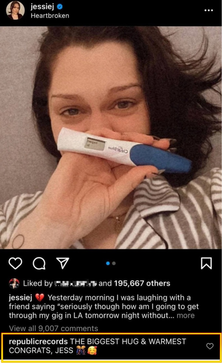 Cụ thể, tài khoản Instagram chính thức của Republic Records đã viết: “Gửi đến bạn cái ôm lớn nhất và nồng nhiệt nhất. Chúc mừng Jess nhé!” kèm 2 icon vui vẻ. Có vẻ người quản lý kênh Instagram của hãng đĩa nổi tiếng đã không thèm đọc nội dung bài đăng của Jessie J và nhầm tưởng nữ ca sĩ đang chia sẻ tin vui nên mới xảy ra cớ sự này.