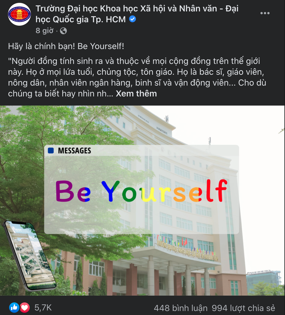 Mới đây, Đại học Khoa học Xã hội và Nhân văn (ĐH Quốc gia TP HCM) đã "bắn" một tín hiệu vô cùng tích cực trên trang fanpage của nhà trường, nhằm ủng hộ cộng đồng LGBTIQ+, được hàng ngàn lượt thả tim.