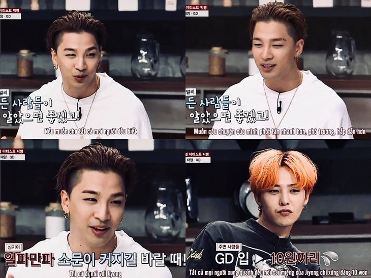 Tiếp đó, Tae Yang còn nói thêm: “Gần đây cậu ấy còn tự nói, bản thân bây giờ đã kín miệng hơn trước rồi. Nên cái miệng đáng giá 500 won…" thì bị G-Dragon cướp lời: “giờ tăng thành 50 won”