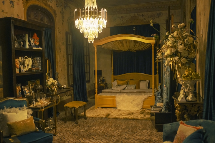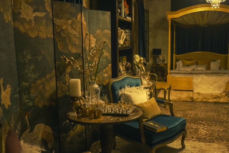 Phòng Lý Lệ Hà được thiết kế theo phong cách hoàng gia, các nội thất theo tông màu vàng hoàng hậu. Thể hiện tính cách và khát khao của nhân vật này.